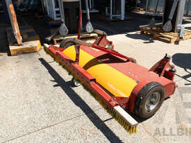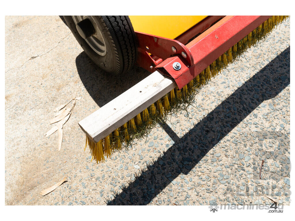 Ground-driven, tow-behind device for the cleaning and care of artificial turf.