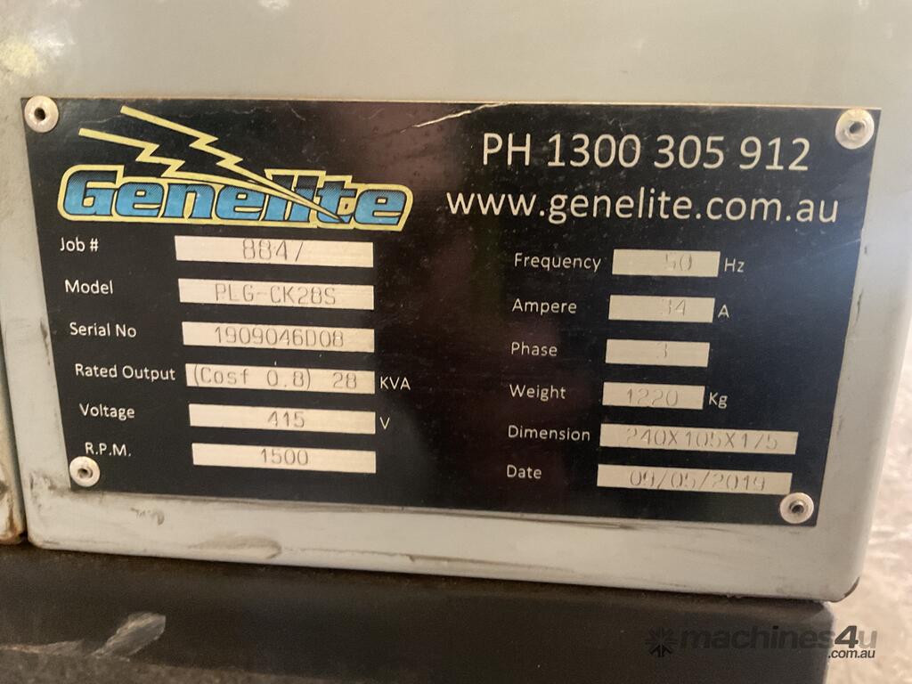 05/2019 415v PLG-CK28S 3 Phase Genelite Genset,Dimensions Approx - 2400mm (L) x 1000mm (W) x 1750mm (H), Hours Showing - 900, Fitted With - Emergency Stop Button, Battery Isolator & Tyne Pockets, Used/General Wear & Tear, Working When Tested,Serial No: 1909046D08