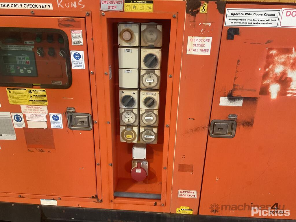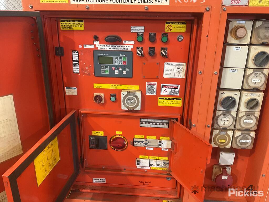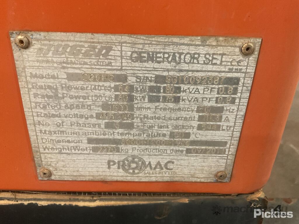 09/2011 Promac/Nugen S80PS 3 Phase Portable Genset - 80kVa,Approx Dimensions - 3000mm (L) x 1200mm (W) x 1900mm (H), Fire Extinguisher Holder (No Fire Extinguisher Included), Tyne Pockets, Battery Isolator, Emergency Stop Buttons, Used/General Wear & Tear, Untested & Unknown Working Condition.,Serial No: SG10092387