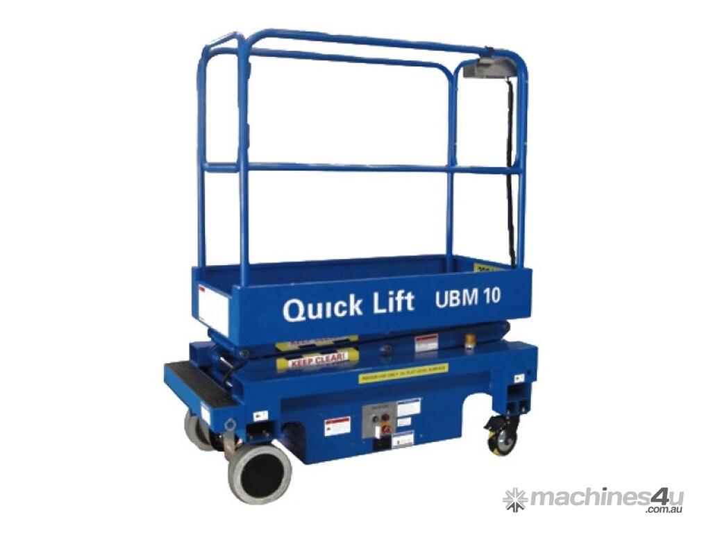 Self-propelled UBM Quick Lift mini scissors allow operators to work safely and continuously at heights up to 5.9 metres when frequent platform re-positioning is required. Three-dimensional movement is controlled from the elevated platform. The compact footprint and tight turning radius of the self-propelled UBM Quick Lift mini scissor lifts make it the ideal choice for tasks demanding precise platform location in tight settings. Applications environments are similar to those listed under UB mini scissor lift series.