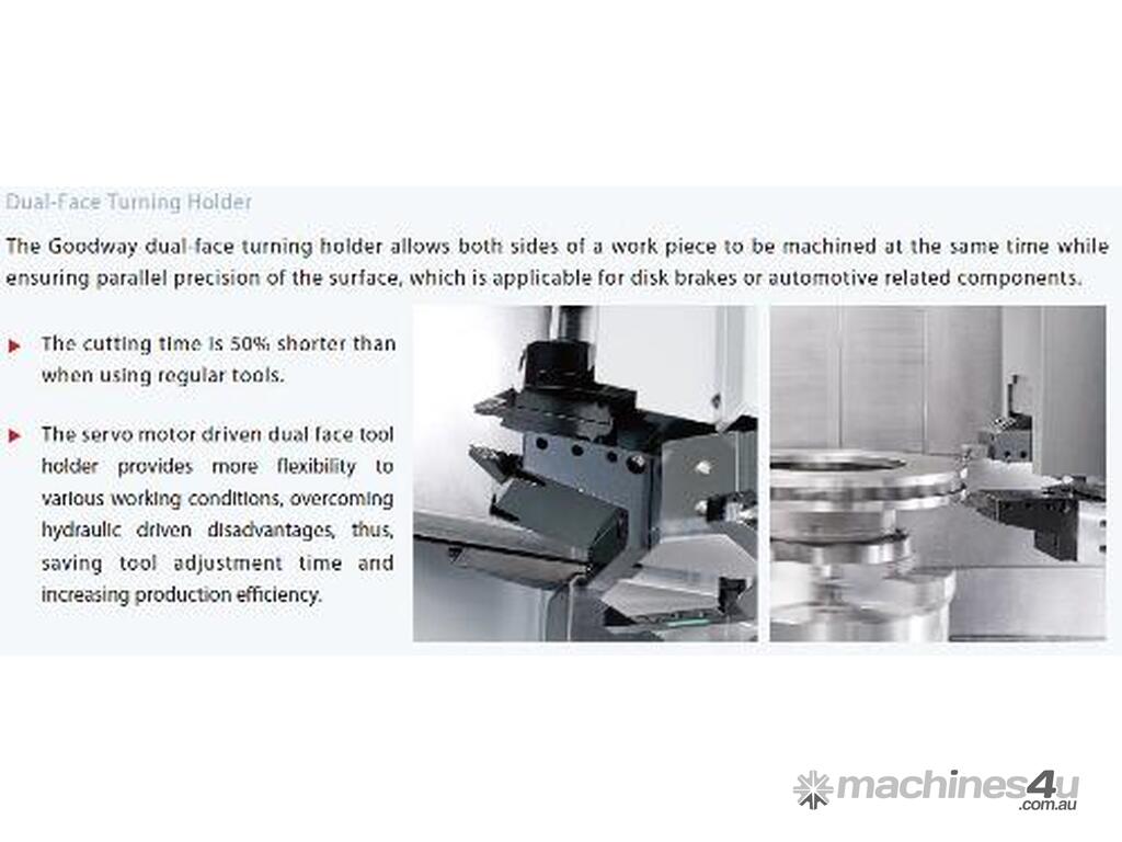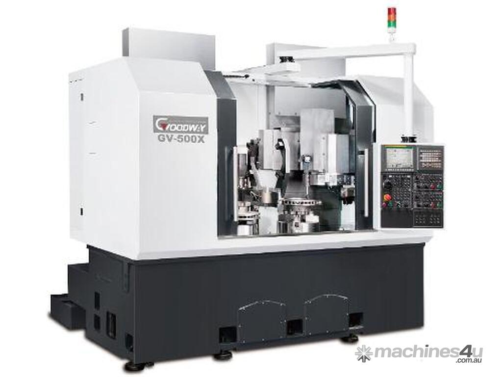 Packed with the latest machine tools technology and high precision turning capabilities, the GOODWAY GV-500 series high speed vertical CNC turning center combines a super rigidity structure and precision linear guideways with a servo indexing turret and powerful spindle. These series features a compact machine size with heavy duty turning capabilities. In addition to the GV-500 series, the GV-500X series twin spindles & turrets equipped with loading & unloading systems can complete disk-shape work-pieces that need multi-processing in one single setup which saves a great amount of time and increases production effciency to meet your needs of today and tomorrow.