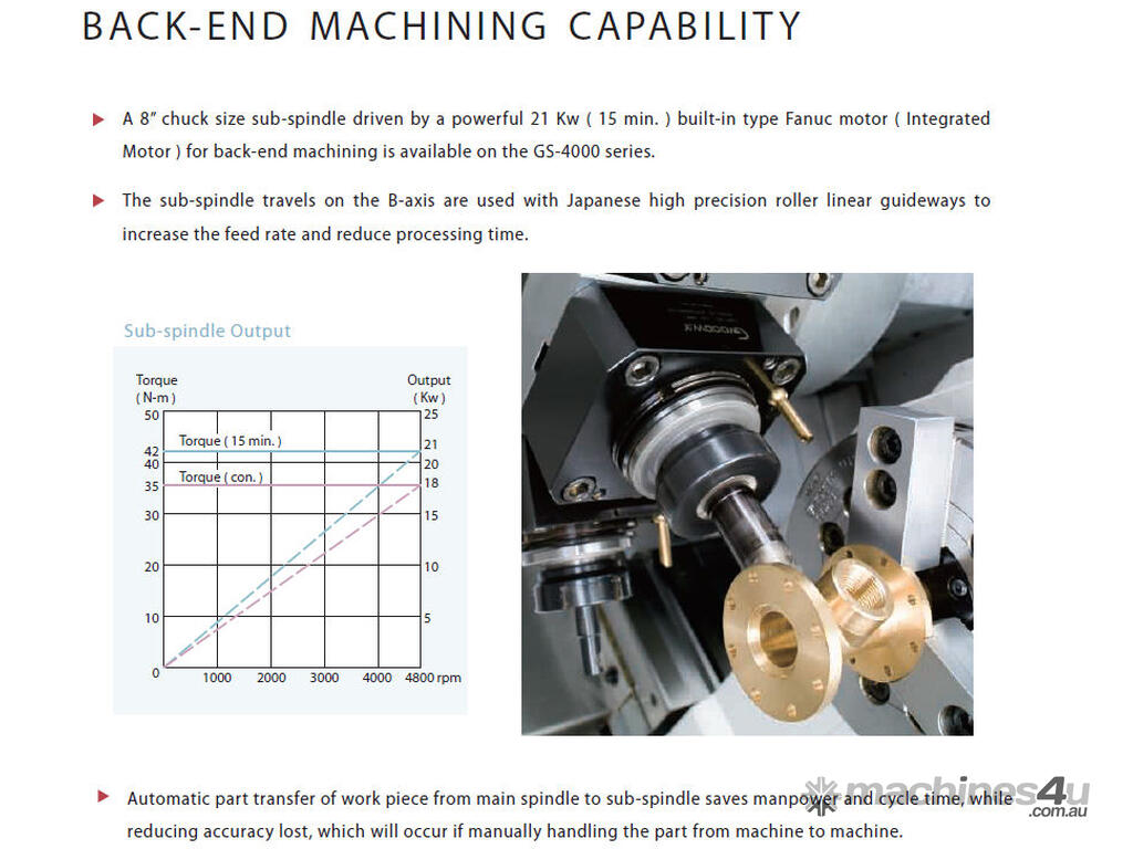 For those seeking a heavy-duty maximum performance turning centre that’s packed with the latest technologies, GOODWAY’s GS-4000 series is the perfect answer. These machines offer awesome turning power, 37 kW 2-speed gear-head spindles to easily turn work pieces up to 24" diameter, and to accommodate various work piece lengths, 4 bed sizes offering maximum tuning lengths ranging from 750 ~ 3,000 mm are available. Live tooling is standard and and Y-axis and sub-spindle models further increase machining efficiency and accuracy, while reducing man power. Furthermore, GOODWAY machines are always fully loaded with standard features that are either not available or costly options found on other machines. Features such as chip conveyor, programmable base tailstock, turning tool holders are standard plus many more.