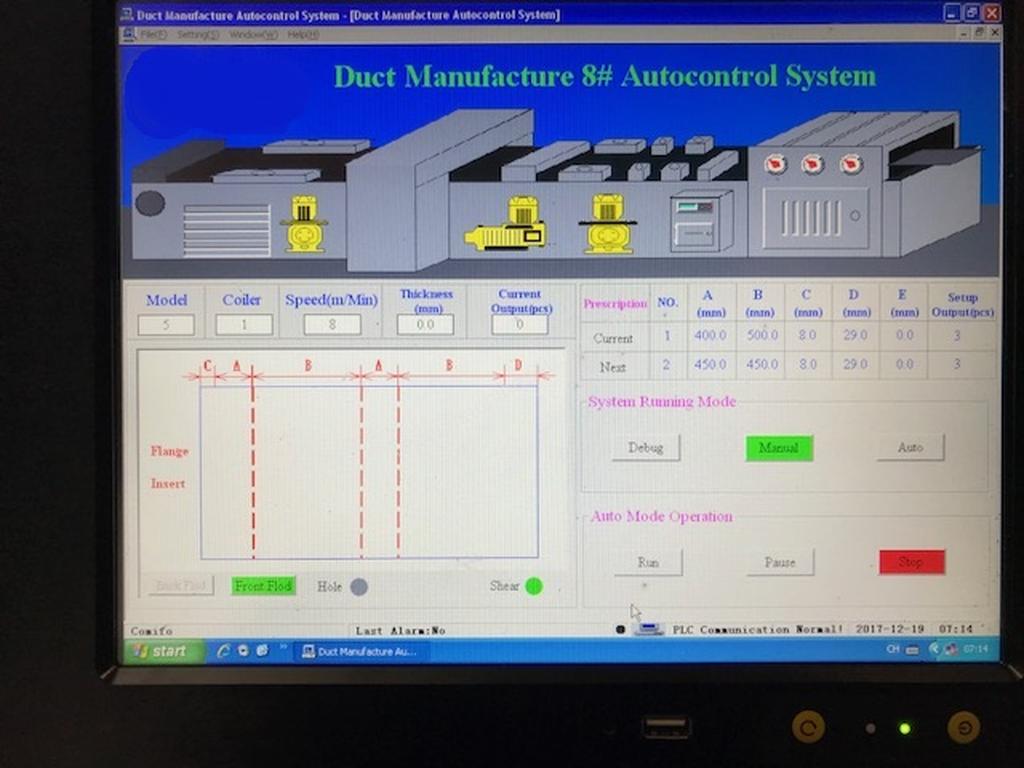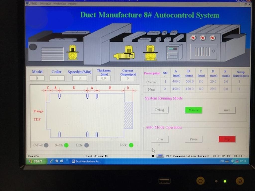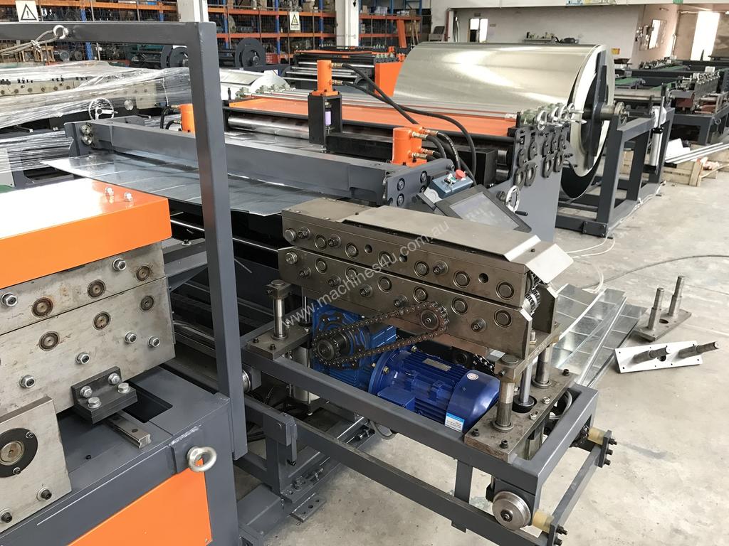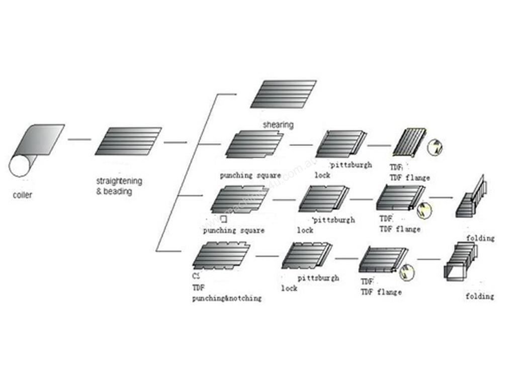 This auto line consists of decoiler (a special design which is easy to load coils in construction site), straightening, beading, punching, notching, shearing, patented automation Pittsburgh lock forming (shearing, Pittsburgh lock, right angle lock in one time), duplex TDF flange forming, duplex right angle lock forming (for angle iron), and TDF folding. It