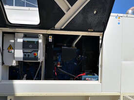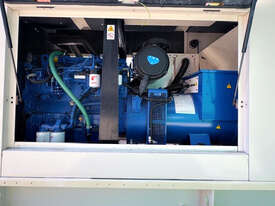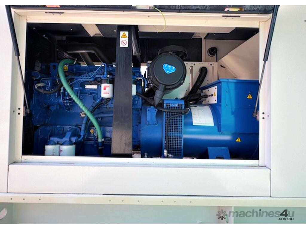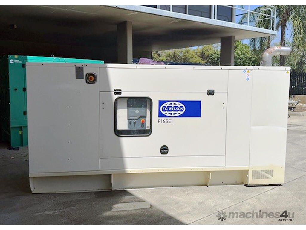 Pre-owned FG Wilson P165E1 generator with Perkins engine and FG Wilson–branded Leroy Somer alternator. Showing low hours, freshly serviced and tested, housed in a weather-protected, sound-attenuated canopy — a reliable power solution for commercial and industrial applications.