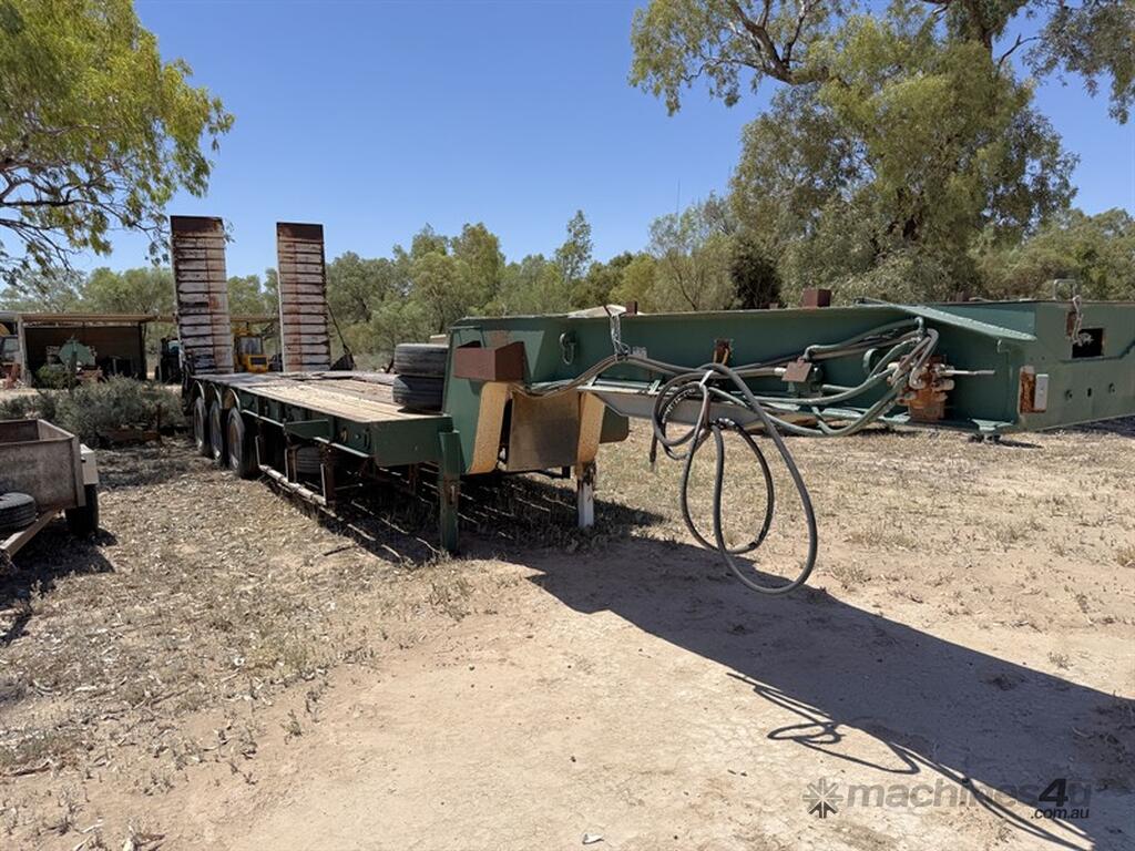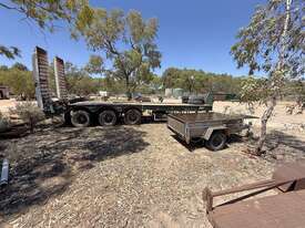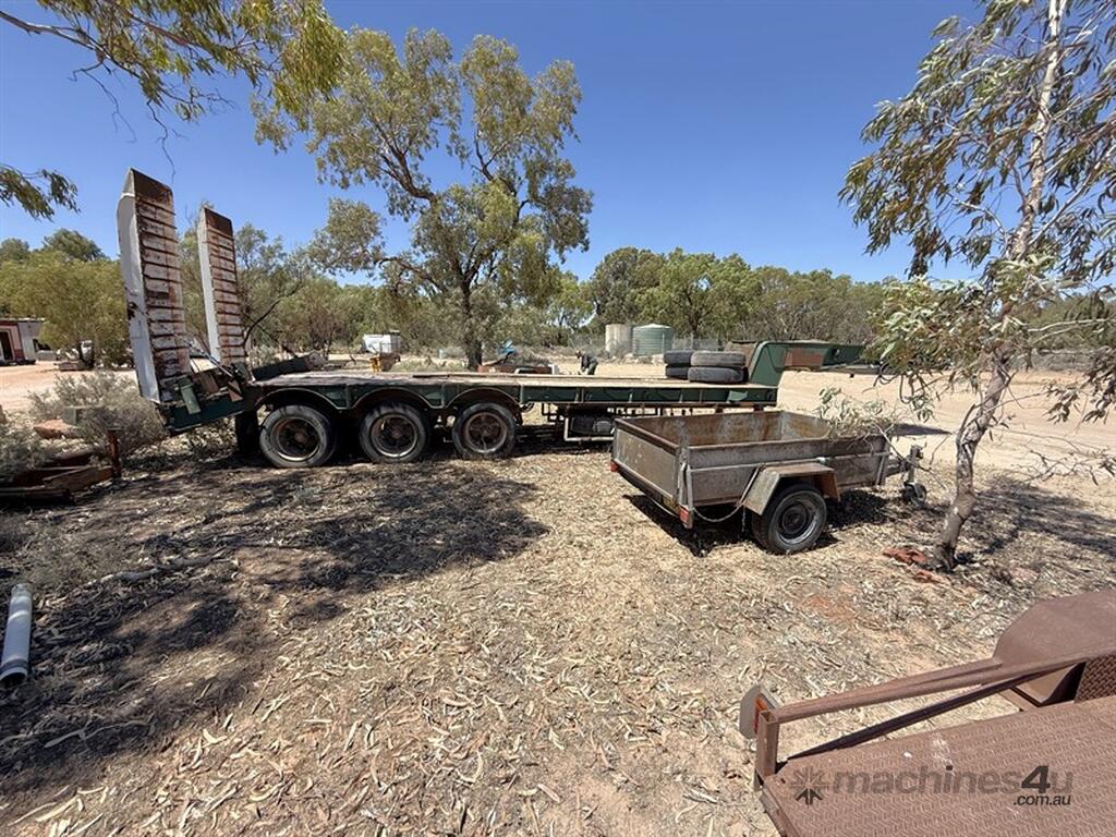1973 Custom-Made Tri-Axle Low Loader VIN: WNEVT25738001. ATM 47000, GCM 27000. Heavy duty low loader, pitted annually and well suited to an earthmover or property owner. Fitted with a 25,000lb hydraulic winch with 17mm rope, good ramps, and manual outriggers also included on the beavertail, 4 tyre rack and 6 spare tyres (some unserviceable).