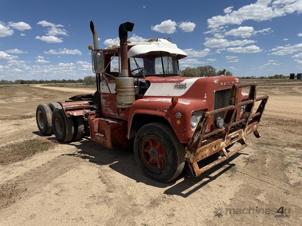 1973 Mack R600 CHASSIS: R685RST11058. Fitted with a 237hp Maxidyne engine, 5-speed Maxitorque gearbox, bogie drive Mack differentials on Camelback suspension. Equipped with hydraulics and bullbar. Starts and drives. Vendor states clutch may require adjustment or replacement. Truck is suitable for on farm use or restoration project.
