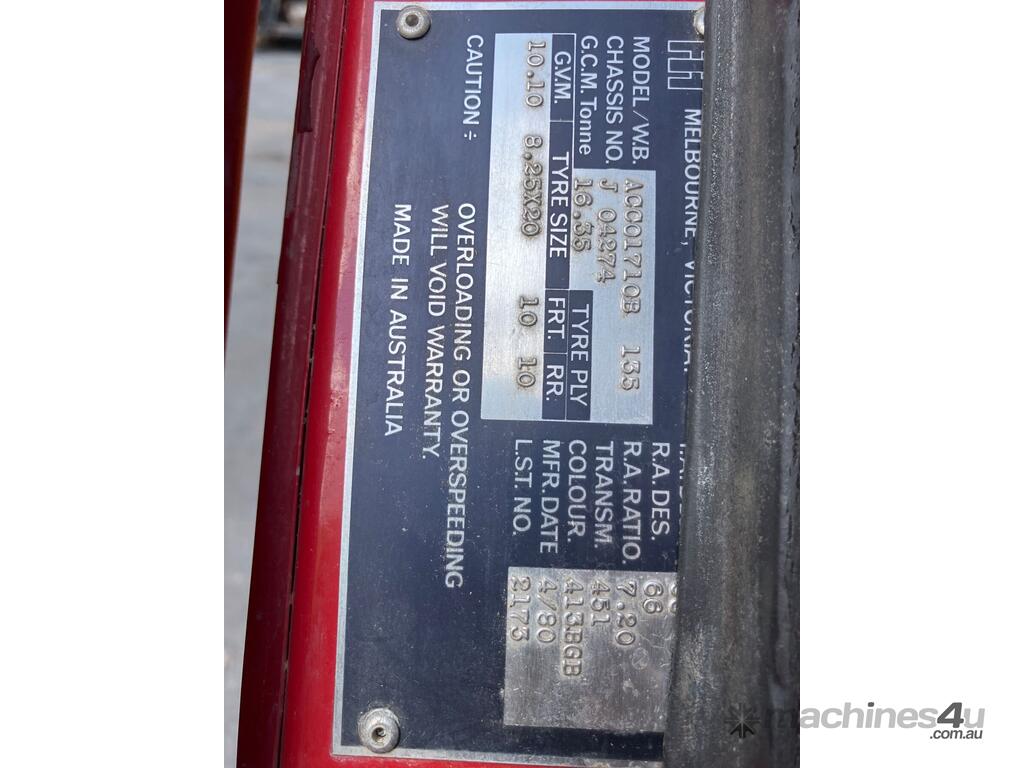 CP: 04/1980,International,ACCO 1710B,Fire Truck,Automatic,Leaf Spring Suspension ,V8,8 Cyl,Petrol,Carburettor,39243 (Kms. Showing on Odometer),Hourmeter not visible,Colour: Red,Unregistered,Chassis: J 04274,GVM: 10100,GCM: 16350,Sold with No Plates,WOVR Status: WOVR N/A,Incident Type: Not Applicable