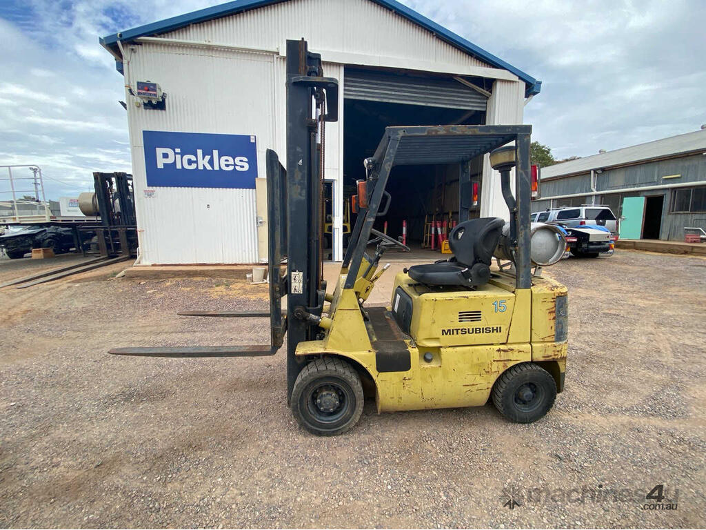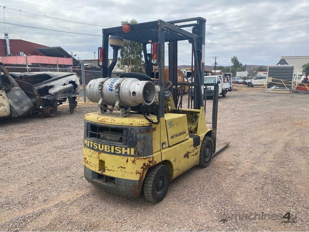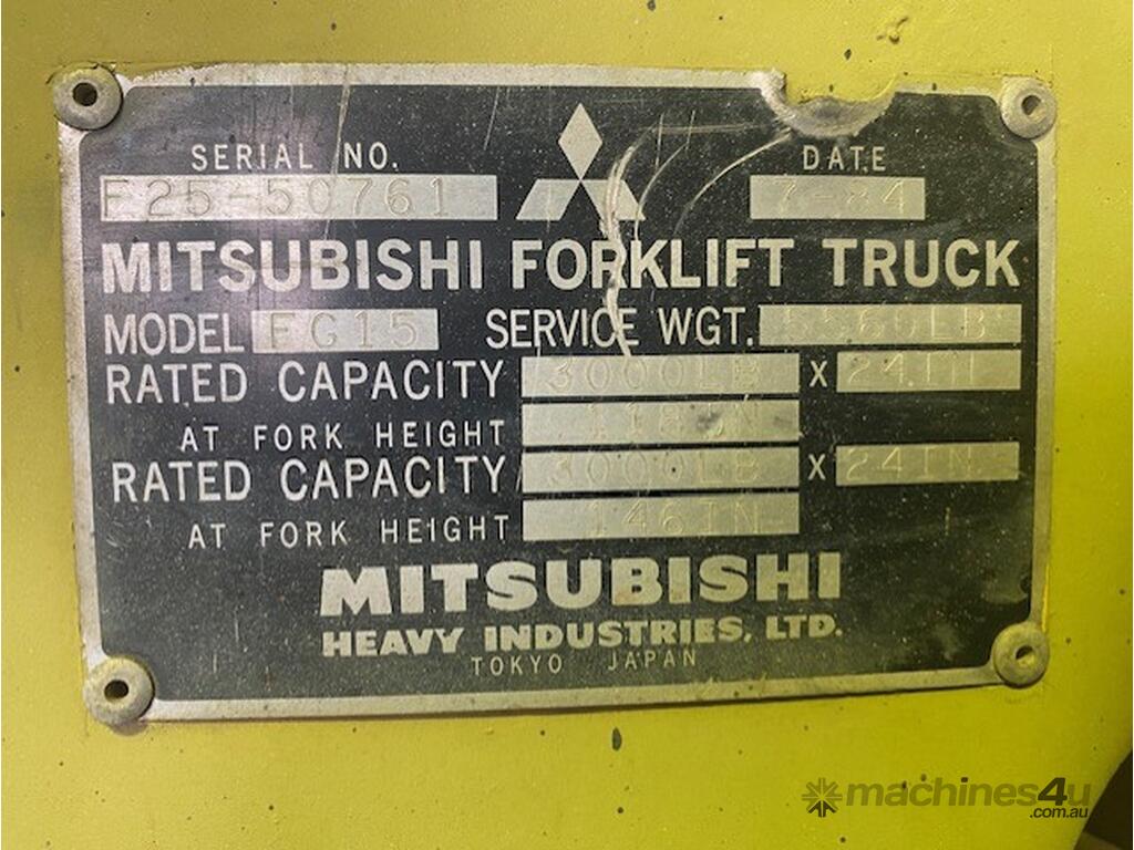 CP: 07/1984,Mitsubishi,FG15,Forklift,Engine #: 4G33EC0393,Gas,Odometer not visible,5397 (Hrs. Showing on Hour meter),Colour: Yellow,Unregistered,Serial No: F25-50761,Sold with No Plates