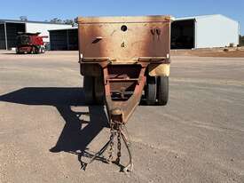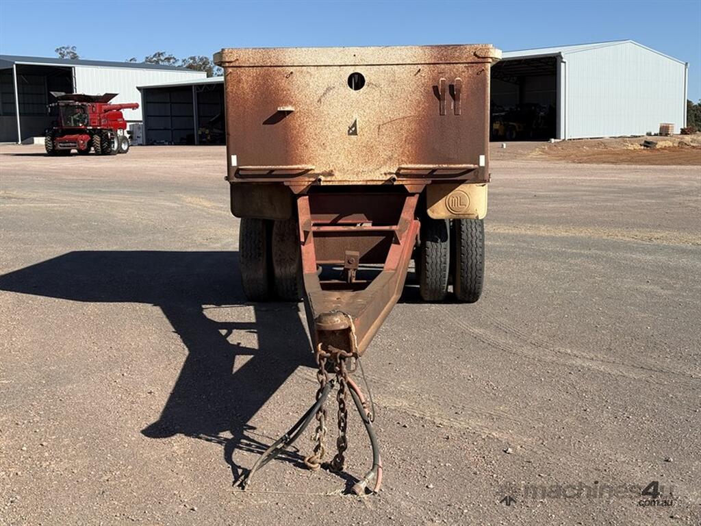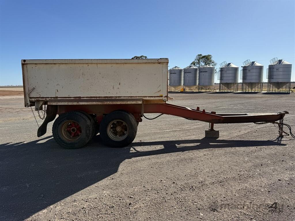 1984 White Steel Bogie Pig Tipper Trailer. Heavy duty steel tipping pig trailer fitted with spring suspension, GP axles and spider rims. Equipped with a Bartlett ball pull hitch, landing legs, jack and LED lighting. Steel bin measuring 3.6m long x 2.5m wide x 1.1m high, with an overall trailer length of 7.9 metres. The bin is in good order for its age, with the hoist appearing serviceable. Tailboard has some small rust areas present, consistent with age and use. This is a very handy pig trailer suitable for