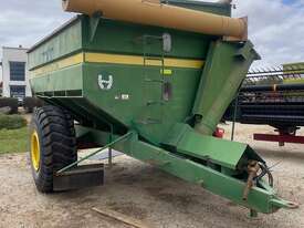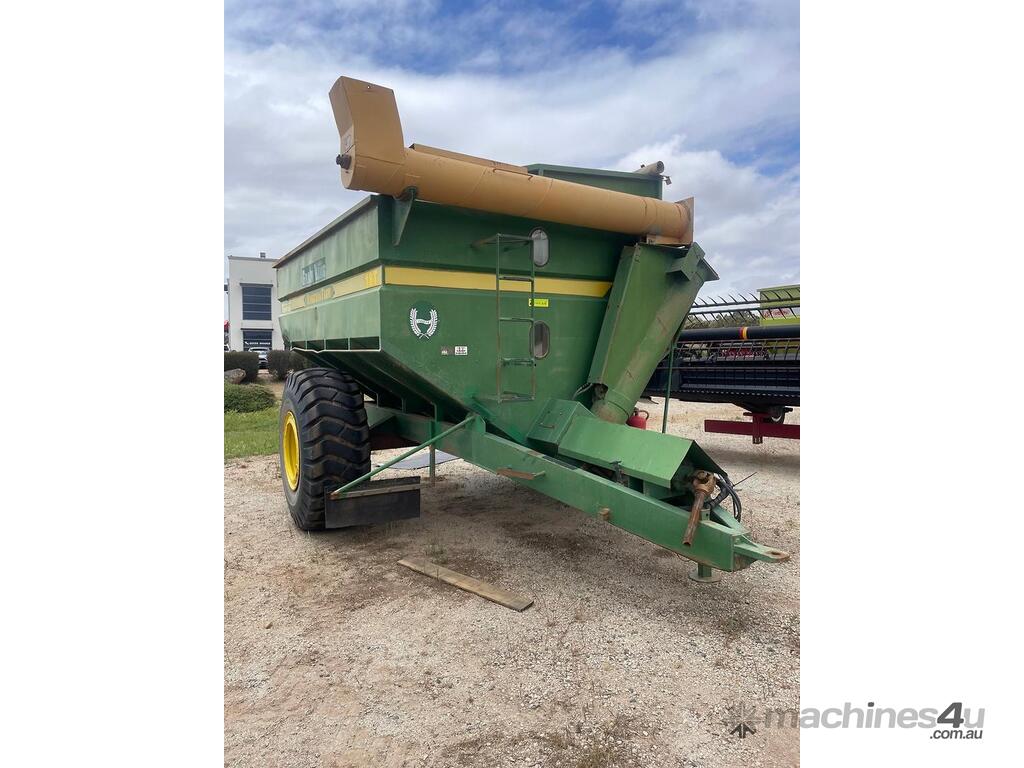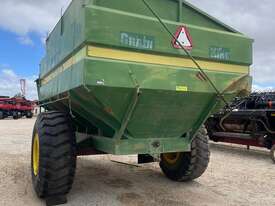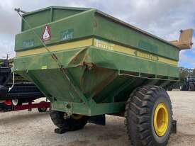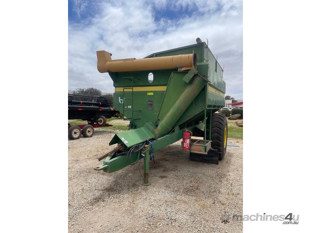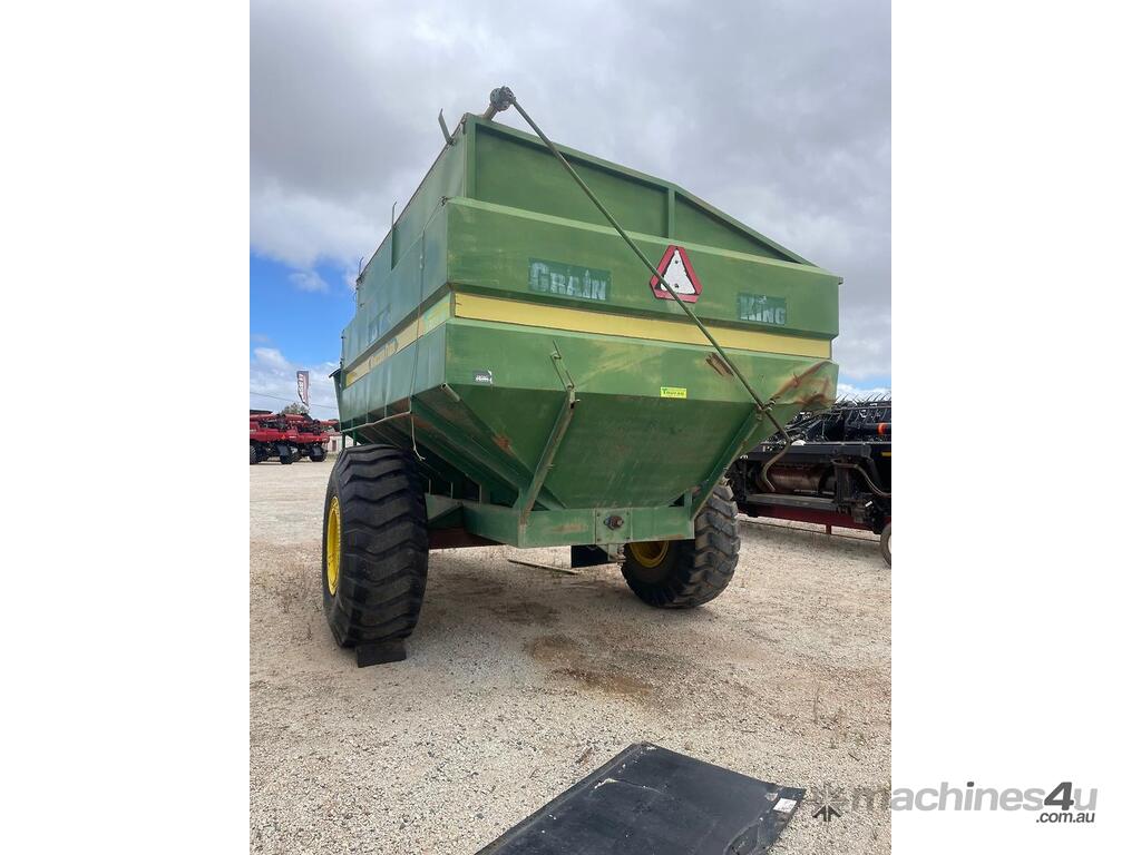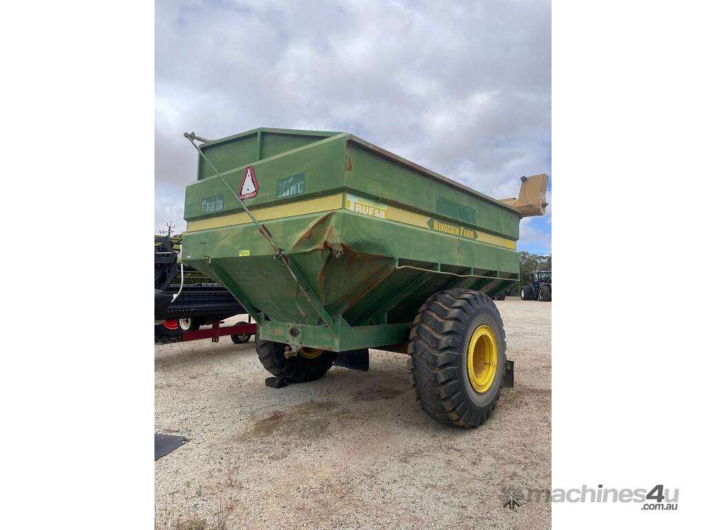 Grain King chaser bin. 18 tonne capacity (Built as 16 tonne, with hungry boards fitted). MY1987. 23.5-25 earthmoving tyres with stubble mats. Tool carrier. 540 PTO driven unload and sweep auger. Roll tarp.