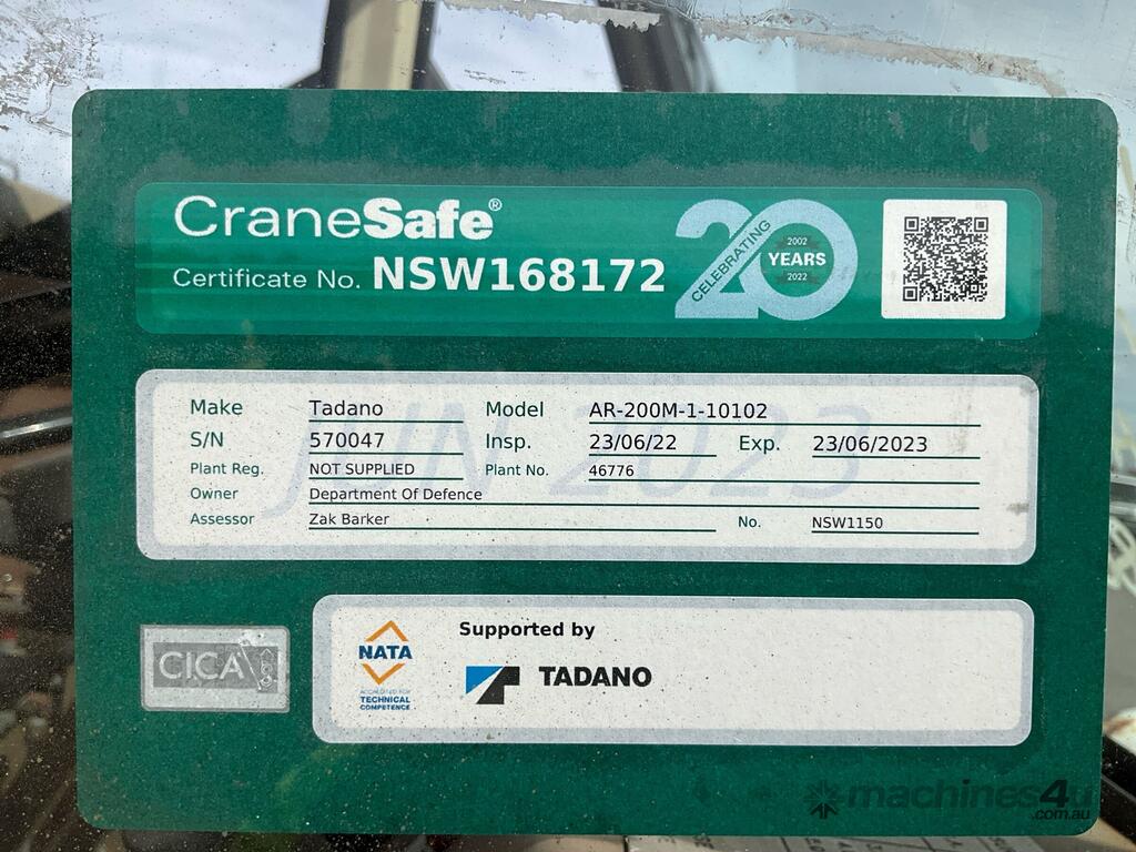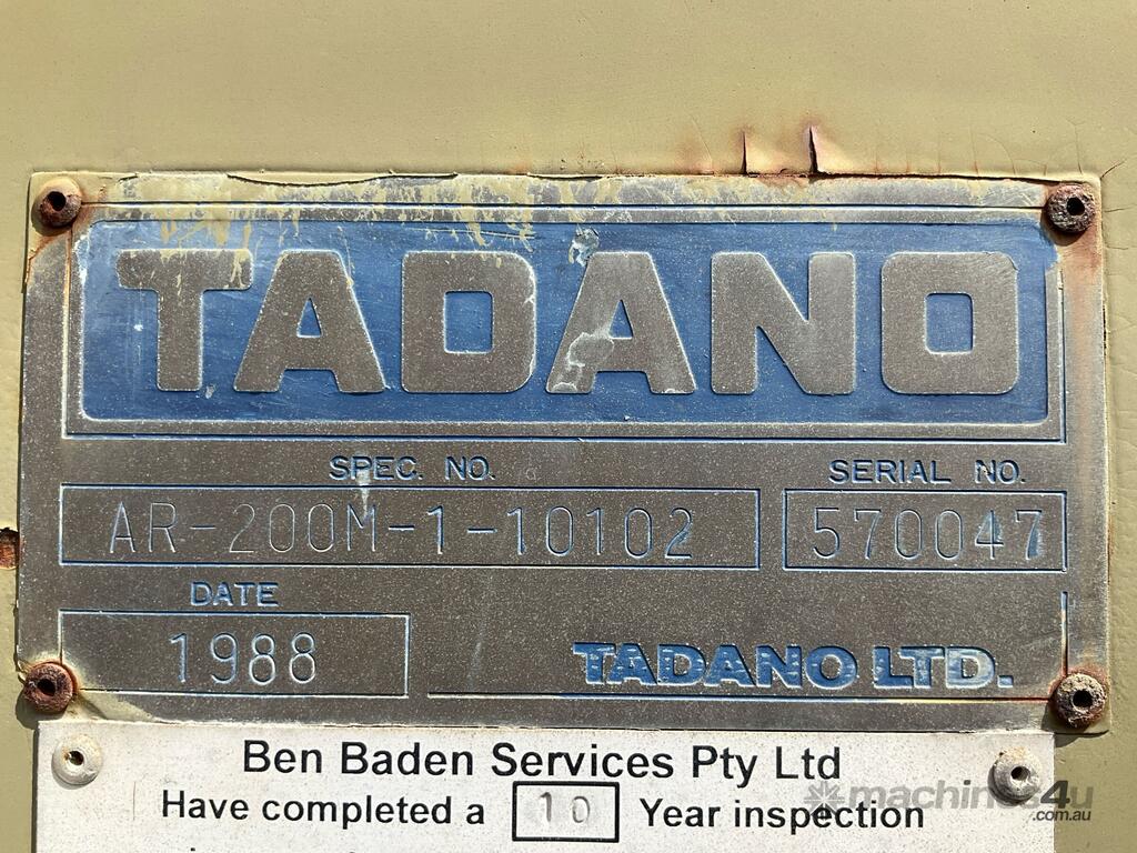 CP: CIRCA 1988,Tadano,AR200M,All Terrain Crane,Engine #: PE6018324T,6 Cyl,Diesel Turbo,16580 (Kms. Showing on Odometer),2190 (Hrs. Showing on Hour meter),Colour: Drab Olive,Unregistered,Chassis: AZ45D00031,Serial No: 570047,Sold with No Plates,Key No: 317E