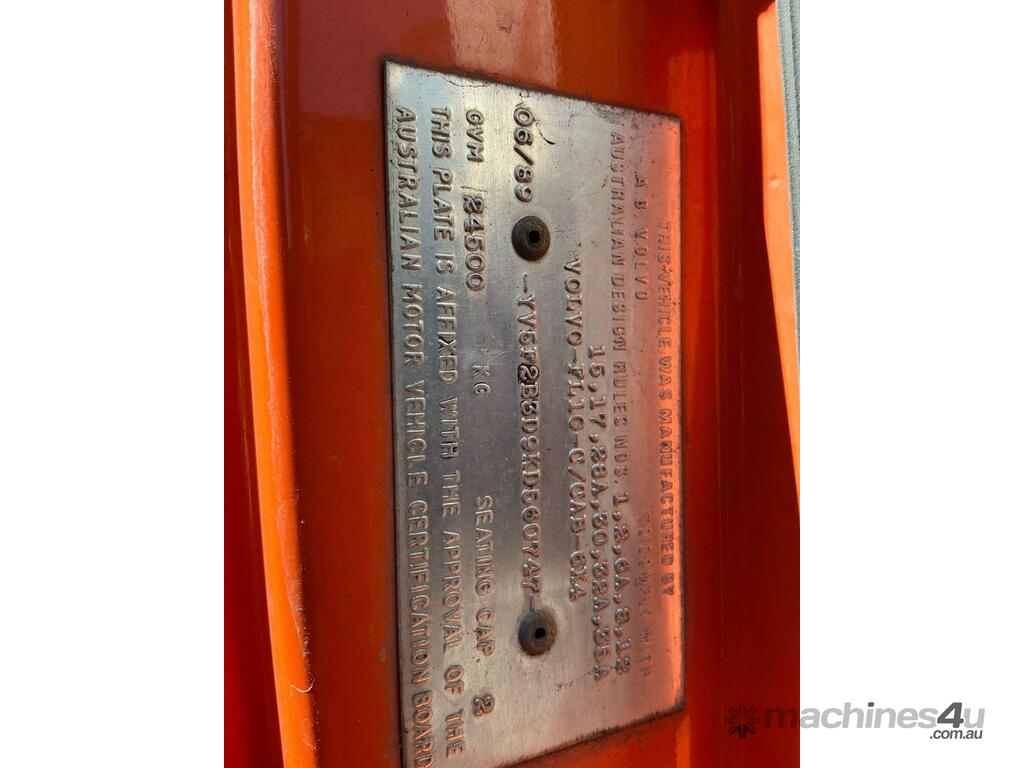 CP: 06/1989,Volvo,FL10,Crane Truck,Manual,Diesel,748785 (Kms. Showing on Odometer),Hourmeter not visible,Colour: Orange,Rego. No: NP(PQI287), Unregistered VIC,VIN: YV5F2B3D9KD560747,Length: 33 ft,GVM: 24500,GCM: 44000,Sold with No Plates,WOVR Status: WOVR N/A,Incident Type: Not Applicable