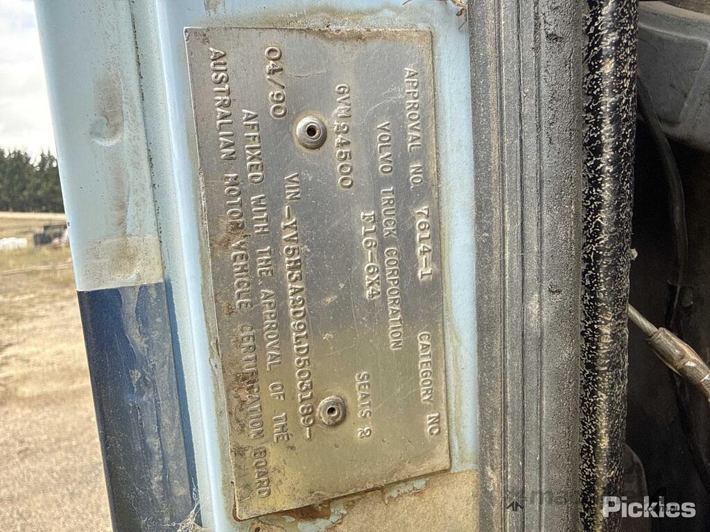 CP: 04/1990,Volvo,F16,Water Cart,Manual,Spring Suspension ,6 Cyl,Diesel Turbo,7 Gears,754319 (Kms. Showing on Odometer),9643 (Hrs. Showing on Hour meter),Colour: Blue,Unregistered,VIN: YV5H3A2D9LD503189,GVM: 24500,Sold with No Plates