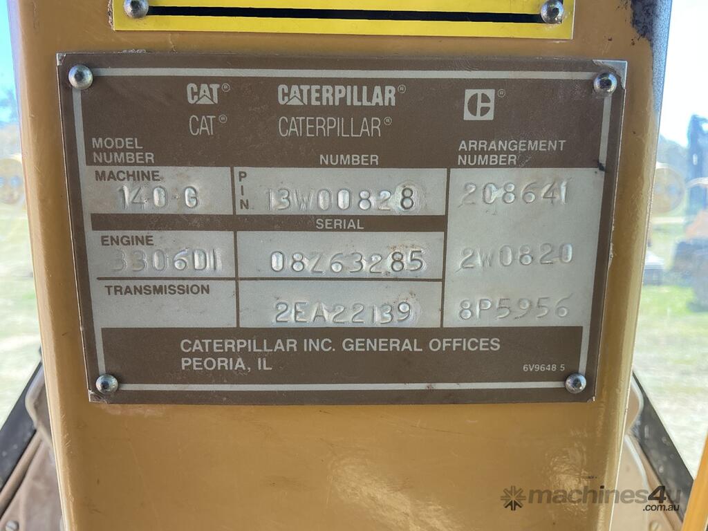 CP: CIRCA 1991,Caterpillar,140G,Grader,Engine #: 08Z63285,6 Cyl,Diesel,Turbo,Odometer not visible,11551 (Hrs. Showing on Hour meter),Colour: Yellow,Rego. No: 79258C,Serial No: 13W00828,Sold with No Plates
