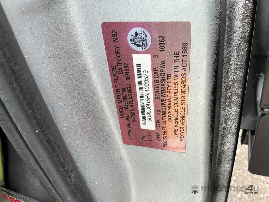 CP: CIRCA 1992,Built: 06/1992,Nissan,Atlas,Tilt / Slide Tray,Manual,Diesel,146127 (Kms. Showing on Odometer),Hourmeter not visible,Colour: Black,Rego. No: ZYN478 VIC,VIN: 6U9000H5H41000529,Length: 6 m,GVM: 5700,Sold with No Plates,WOVR Status: WOVR N/A,Incident Type: Malicious