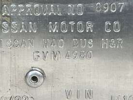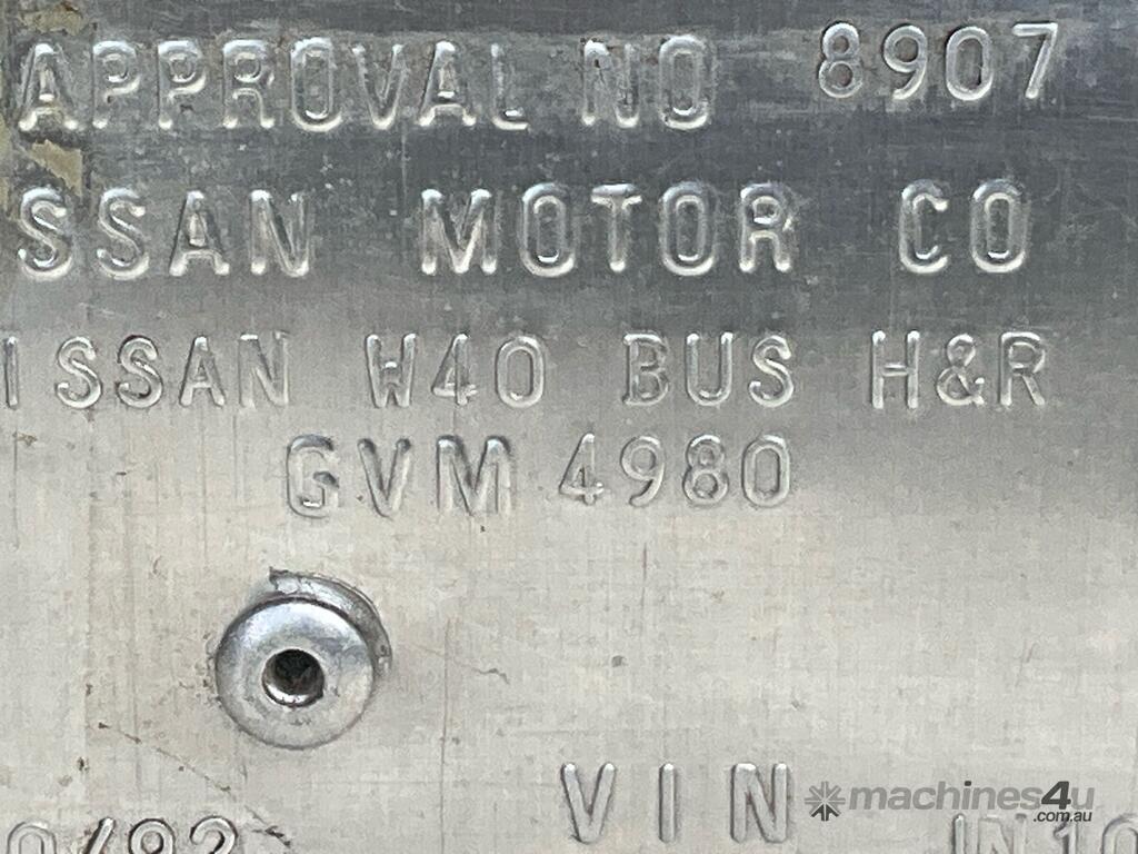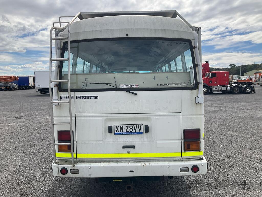 CP: 10/1992,Nissan,Civilian,Bus,Manual,Spring ,6 Cyl,Diesel,5 Gears,23781 (Kms. Showing on Odometer),Hourmeter not visible,Colour: White,Rego. No: XN28VV NSW,Rego expiry: 09/10/2026,VIN: JN10RGW40A0051019,Key No: 248E,Length: 6.9 m,GVM: 4980,Sold with No Plates,Key No: 248E