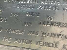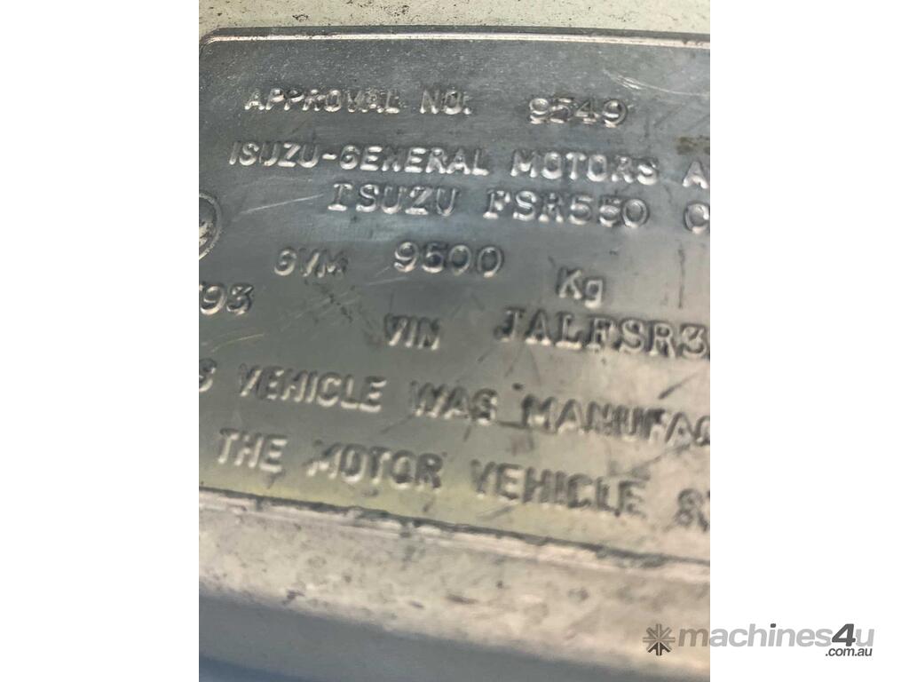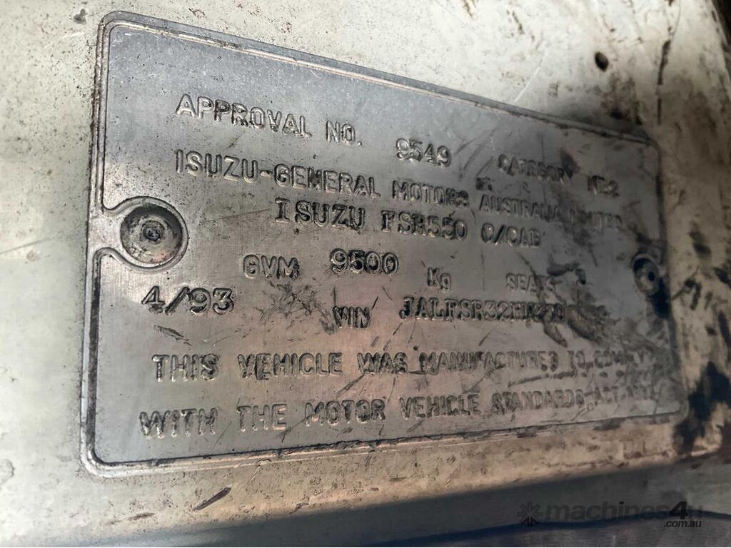 CP: 04/1993,Isuzu,FSR550 LWB,Table Top,Manual,Spring ,Engine #: 6HE1691672,6 Cyl,Diesel,6 Gears,665188 (Kms. Showing on Odometer),Hourmeter not visible,Colour: White,Rego. No: TAL352 NSW,Rego expiry: 18/11/2025,VIN: JALFSR32HN3000299,Key No: 36E,Length: 8.8 m,GVM: 9500,Sold with No Plates,Key No: 36E