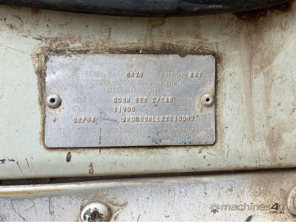 CP: 02/1994,Hino,GD,Crane Truck,Manual,Leaf Spring,6 Cyl,Diesel,6 Gears,404337 (Kms. Showing on Odometer),Hourmeter not visible,Colour: White,Rego. No: NP(CM18WL), Unregistered NSW,VIN: JHDGD3HLLXXX10097,Length: 8 m,Sold with No Plates,WOVR Status: Repairable Write-Off,Incident Type: Malicious