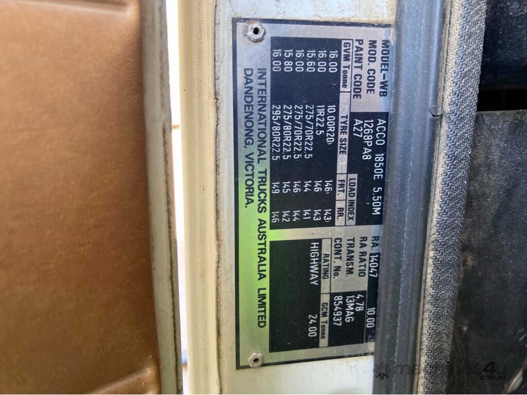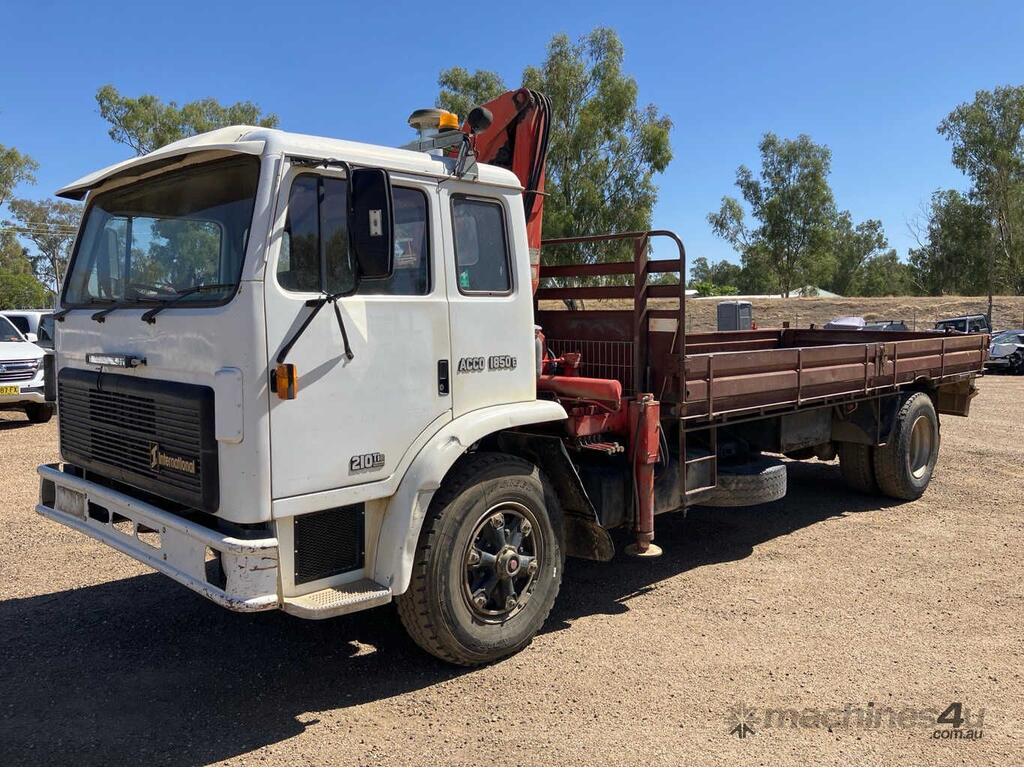CP: 08/1994,International,ACCO 1850E,Flatbed Crane Truck,Manual,Leaf Spring Suspension,Engine #: YD80505U578653Y,Perkins ,6 Cyl,Diesel,7 Gears,295027 (Kms. Showing on Odometer),Hourmeter not visible,Colour: White,Rego. No: NP(AC62DO), Unregistered NSW,VIN: 6F2126800RDA11029,Key No: 2,Length: 8.9 m,GVM: 16000,GCM: 24000,Sold with No Plates,WOVR Status: WOVR N/A,Key No: 2