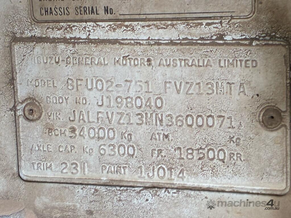 CP: 02/1994,Isuzu,FVZ 1400,Tipper,Manual,Leaf Spring Suspension,6 Cyl,Diesel,9 Gears,394563 (Kms. Showing on Odometer),Hourmeter not visible,Rego. No: NP(FPE401), Unregistered VIC,VIN: JALFVZ13MN3600071,GVM: 22500,Sold with No Plates