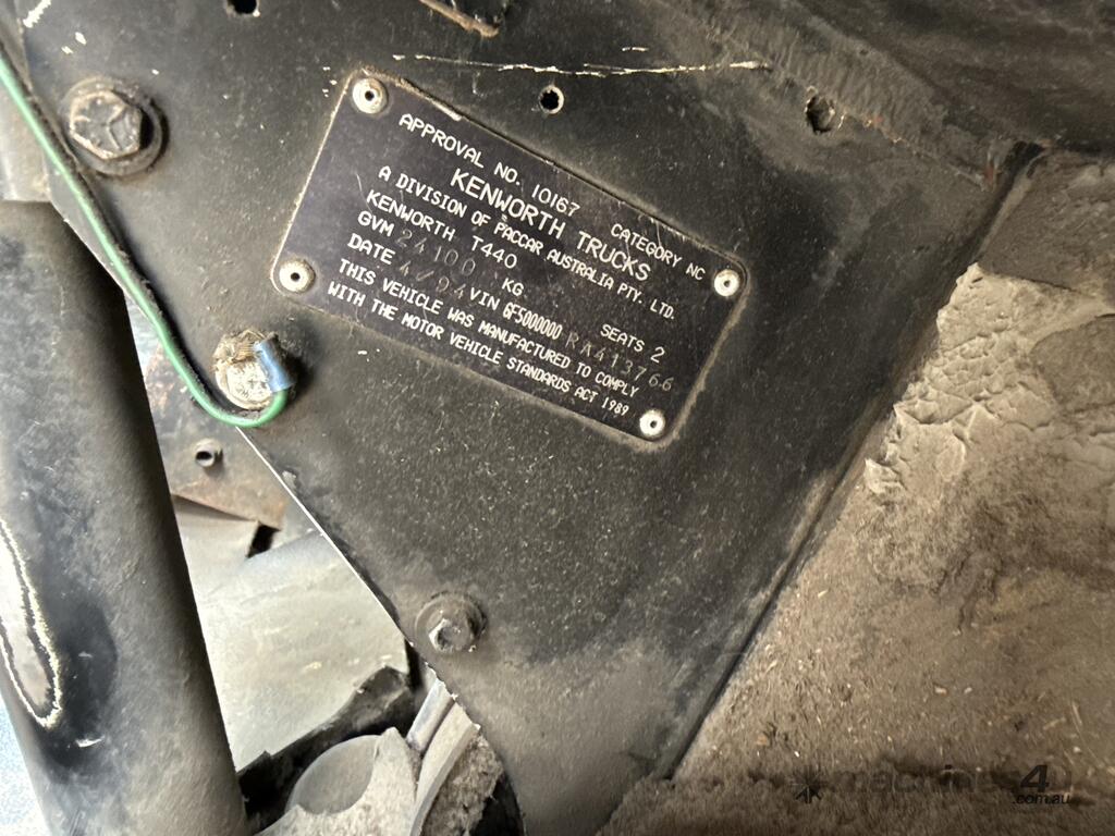 CP: 04/1994,Kenworth,T440,Prime Mover Sleeper Cab,Manual,Engine #: 34713895,Cummins,6 Cyl,Diesel,Intercooler Turbo,18 Gears,388184 (Kms. Showing on Odometer),Hourmeter not visible,Colour: White,Rego. No: NP(618CMG), Unregistered QLD,VIN: 6F5000000RA413766,GVM: 24100,GCM: 46000,Sold with No Plates