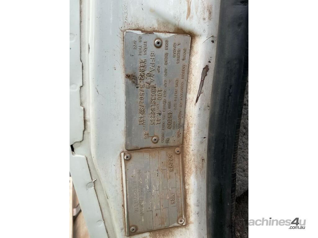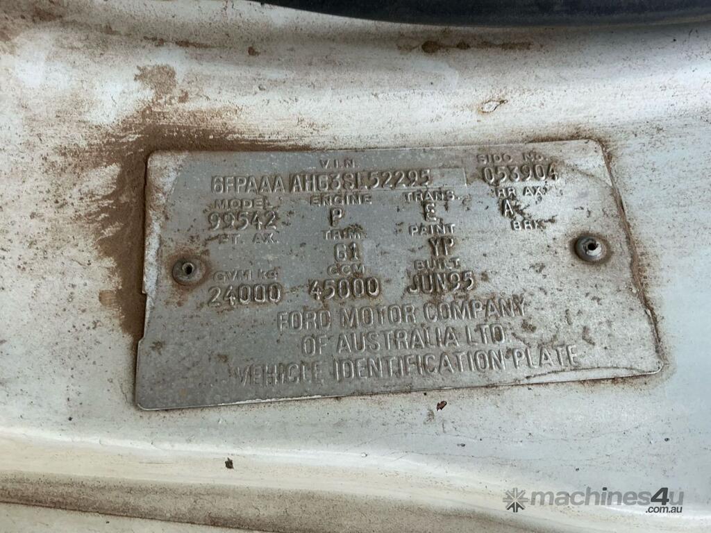CP: 06/1995,Built: 06/1995,Ford,L9000,Cab Chassis,Manual,Diesel,405184 (Kms. Showing on Odometer),Hourmeter not visible,Colour: White,Rego. No: NP(XV42AS), Unregistered NAT,VIN: 6FPAAAAHG3SL52295,Length: 25 ft,GVM: 24000,GCM: 45000,Sold with No Plates,WOVR Status: WOVR N/A,Incident Type: Impact