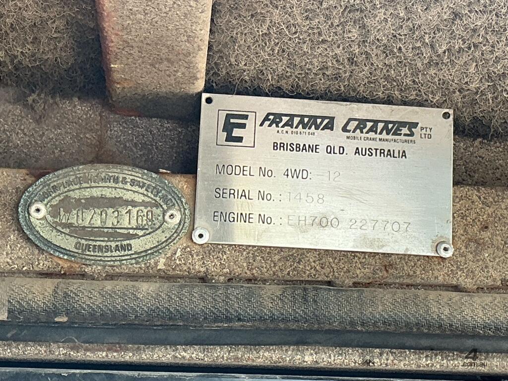 CP: CIRCA 1995,Franna,4WD 12,Pick & Carry Crane,Engine #: EH700 227707,6 Cyl,Diesel,121129 (Kms. Showing on Odometer),2766 (Hrs. Showing on Hour meter),Colour: White,Rego. No: NP(331CYQ), Unregistered QLD,Serial No: 1458,Sold with No Plates