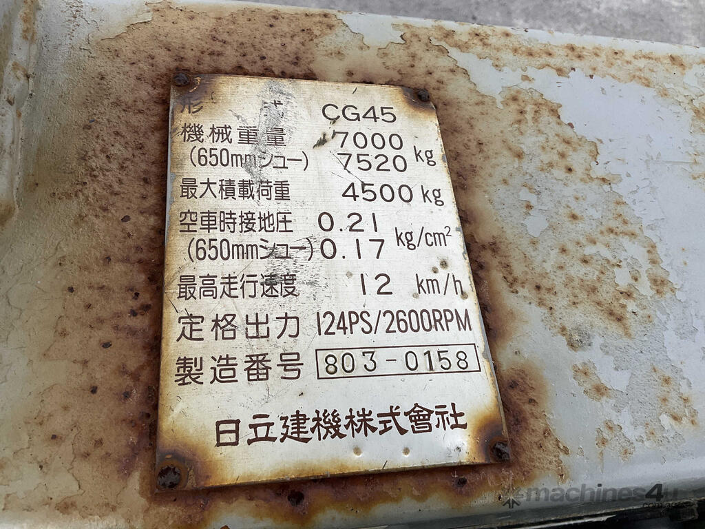 CP: CIRCA 1995,Hitachi,CG45,All Terrain Tracked Carrier,6 Cyl,Diesel,Odometer not visible,4562 (Hrs. Showing on Hour meter),Colour: Grey,Rego. No: NP(XW87FK), Unregistered VIC,Serial No: 8030158,Sold with No Plates,Key No: 464E