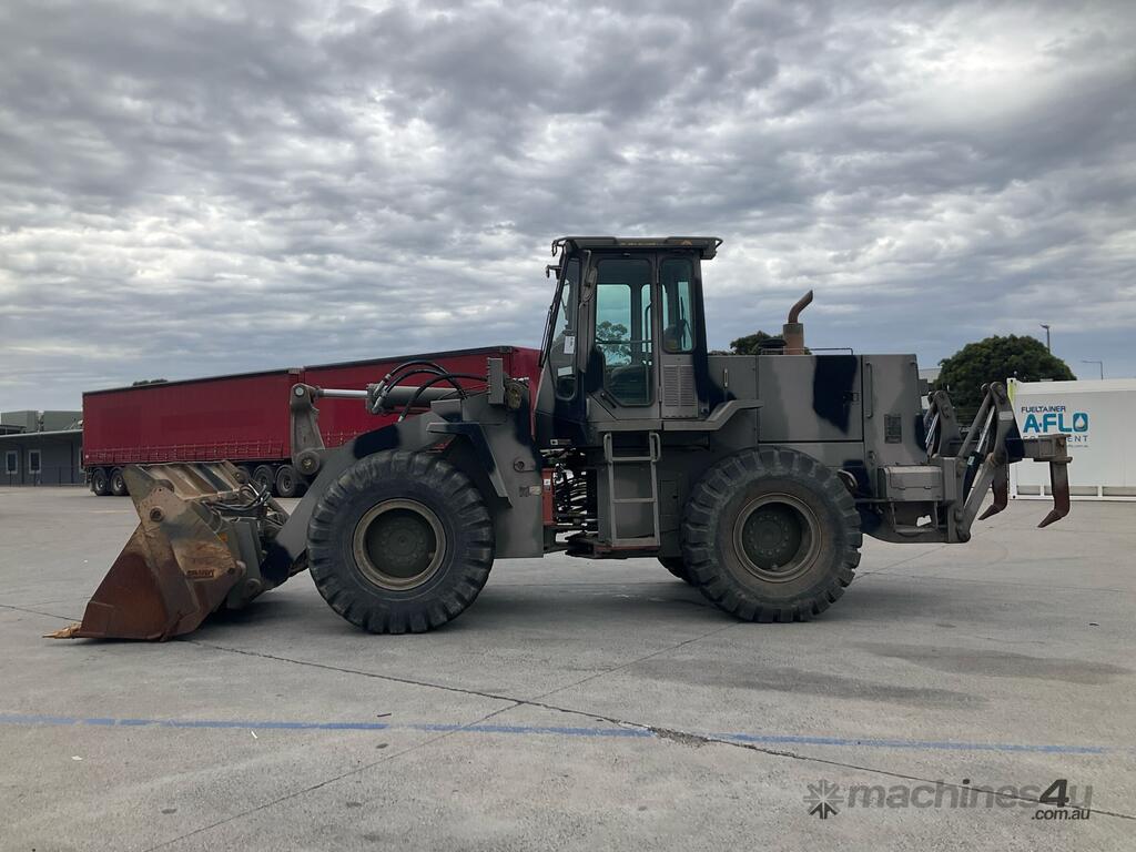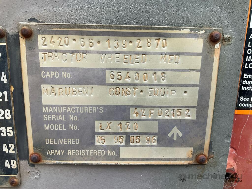 CP: 05/1995,Hitachi,LX120,Articulated Wheel Loader,6 Cyl,Diesel,Odometer not visible,2146 (Hrs. Showing on Hour meter),Colour: Camouflage,Rego. No: NP(201644), Unregistered,Chassis: 42F-02152,Serial No: DWL120E550176,Sold with No Plates