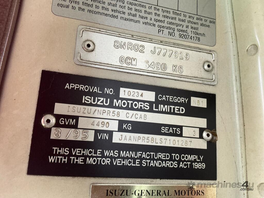 CP: 08/1995,Isuzu,NPR,Pantech,Manual,Diesel,419196 (Kms. Showing on Odometer),Hourmeter not visible,Colour: White,Rego. No: NP(TTW717), Unregistered VIC,VIN: JAANPR58LS7101287,Length: 20 ft,GVM: 4490,GCM: 6490,Sold with No Plates,WOVR Status: WOVR N/A,Incident Type: Malicious