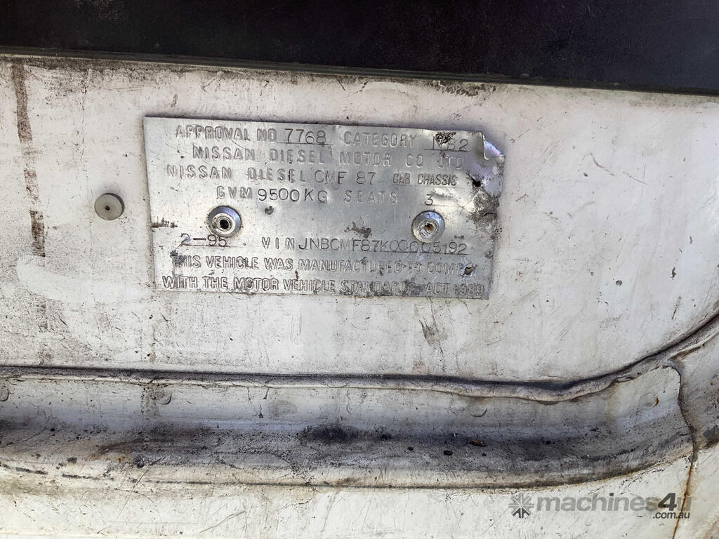 CP: 02/1995,Nissan UD,CM160,Table Top,Manual,Spring,Engine #: FE6012053A,6 Cyl,Diesel Turbo,5 Gears,674547 (Kms. Showing on Odometer),Hourmeter not visible,Colour: White,Rego. No: TNS631 NSW,Rego expiry: 27/02/2026,VIN: JNBCMF87K00005192,Key No: 529S,Length: 9 m,GVM: 9500,Sold with No Plates,Key No: 529S