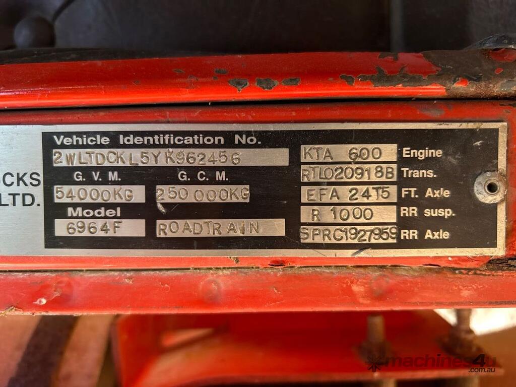 CP: CIRCA 1995,Western Star,6964F,Dump Truck,Manual,18 Gears,679938 (Kms. Showing on Odometer),32790 (Hrs. Showing on Hour meter),Colour: Red,Unregistered,VIN: 2WLTDCKL5YK962456,GVM: 54000,GCM: 250000,Sold with No Plates