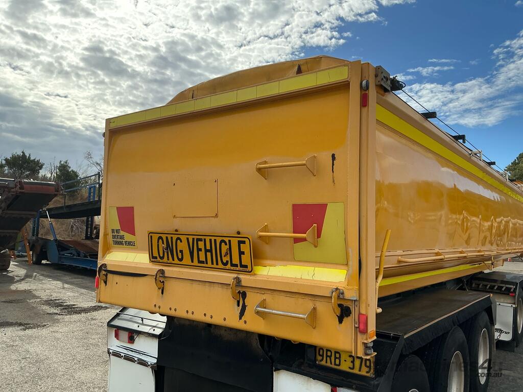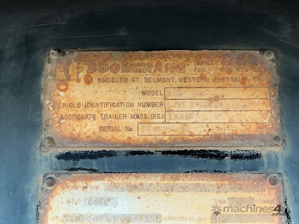 CP: 06/1996,Built: 06/1996,Boomerang,Quin Axle End Tipping Dog Trailer,18803 (Kms. Showing on Hubometer),Colour: Yellow,Rego. No: 9RB379 WA,Rego expiry: 25/05/2026,VIN: 6J9T24000T2AB6003,Plates to All