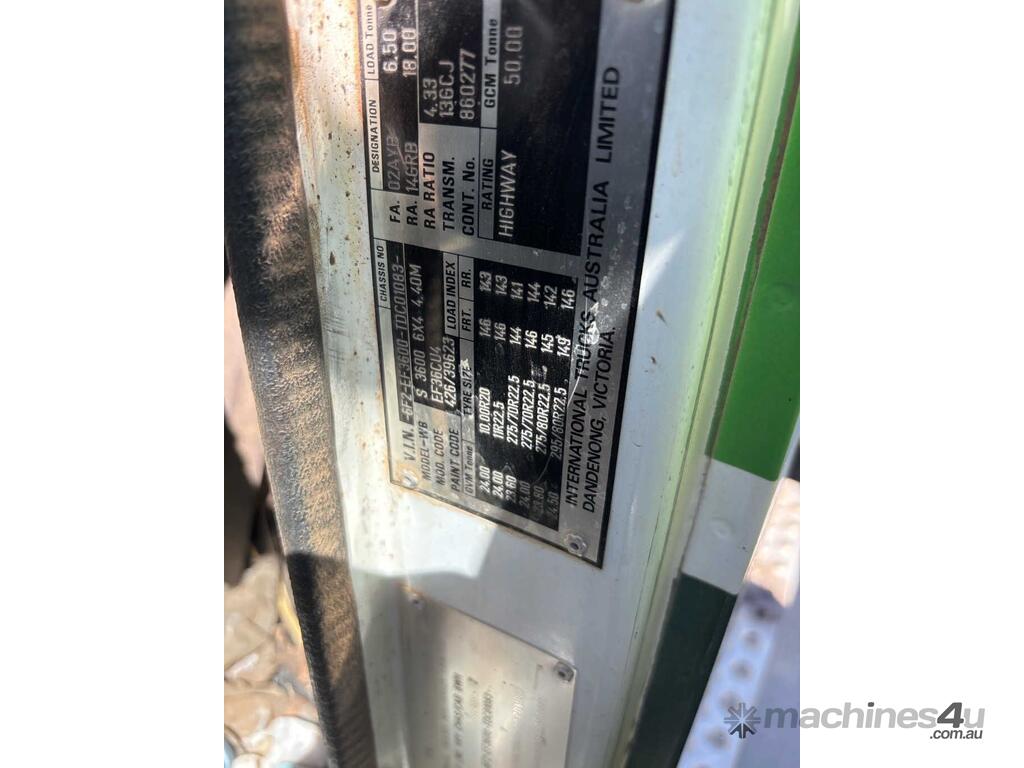 CP: 09/1996,International,S Line 3600,Prime Mover,Manual,Diesel,825241 (Kms. Showing on Odometer),Hourmeter not visible,Colour: Green,Rego. No: NP(41217F), Unregistered VIC,VIN: 6F2EF3600TDC01083,Length: 24 ft,GVM: 24000,Sold with No Plates,WOVR Status: WOVR N/A,Incident Type: Impact