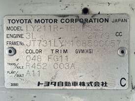 CP: 08/1996,Toyota,Dyna,Table Top,Manual,Spring,4 Cyl,Diesel,412123 (Kms. Showing on Odometer),Hourmeter not visible,Colour: White,Rego. No: NP(CV23LC), Unregistered NSW,VIN: JY731LYM,Length: 5 undefined,GVM: 3350,Sold with No Plates,WOVR Status: WOVR N/A,Incident Type: Impact