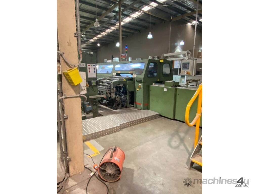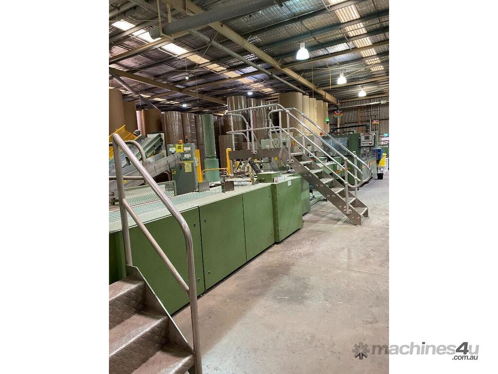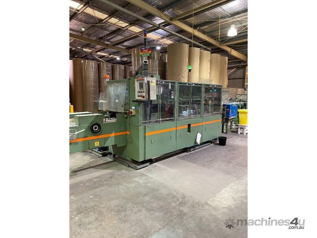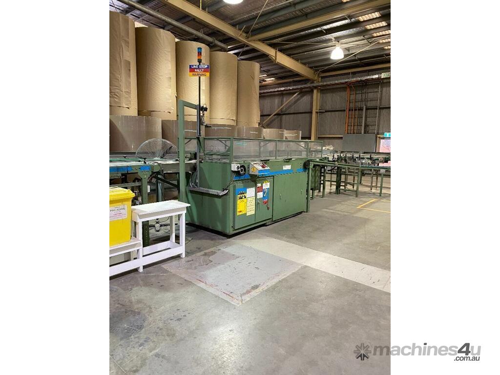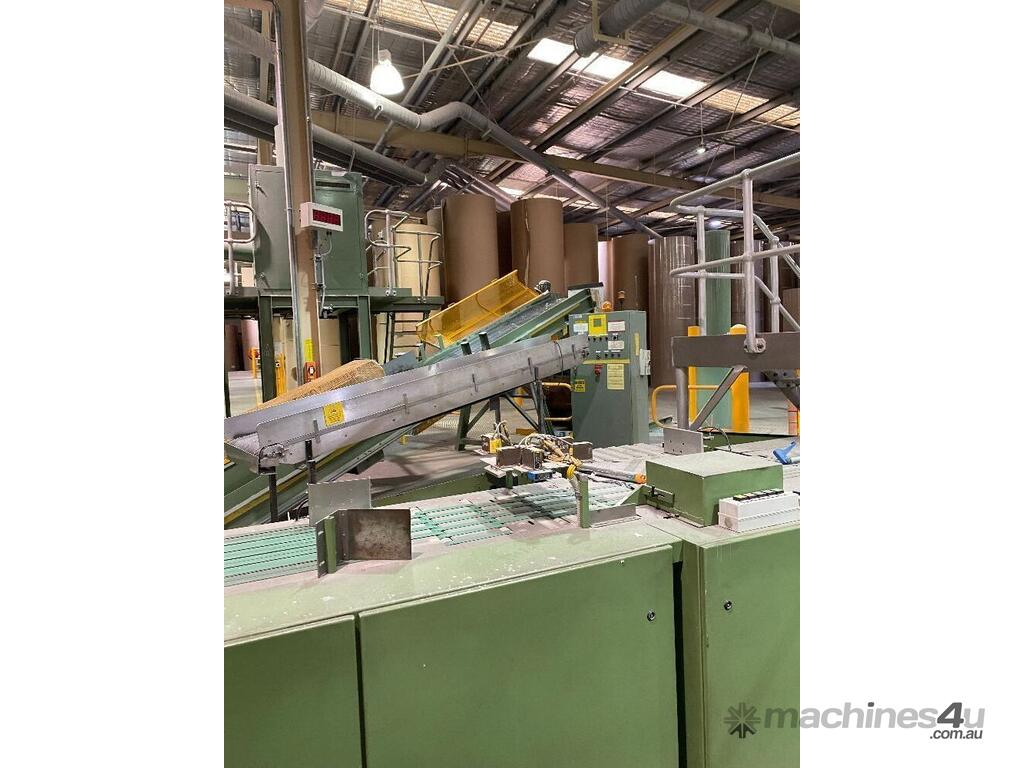 Sheeter complete with line for paper wrapping, labelling, ream collator, two box lines, conveyor to pallet stacker;