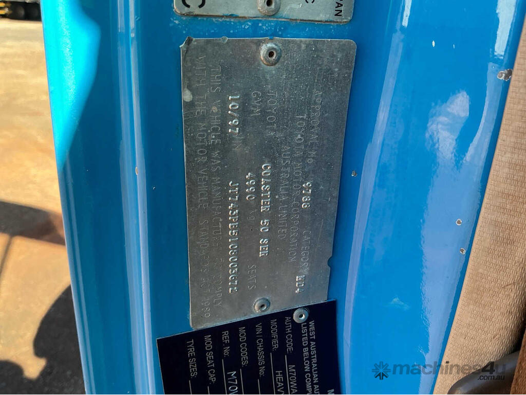 CP: 10/1997,Toyota,Coaster,Bus,Manual,Leaf Spring ,6 Cyl,Diesel,5 Gears,134406 (Kms. Showing on Odometer),Hourmeter not visible,Colour: Blue,Unregistered,VIN: JT743PB,Key No: 190,Length: 21 ft,GVM: 4990,Sold with No Plates,Key No: 190