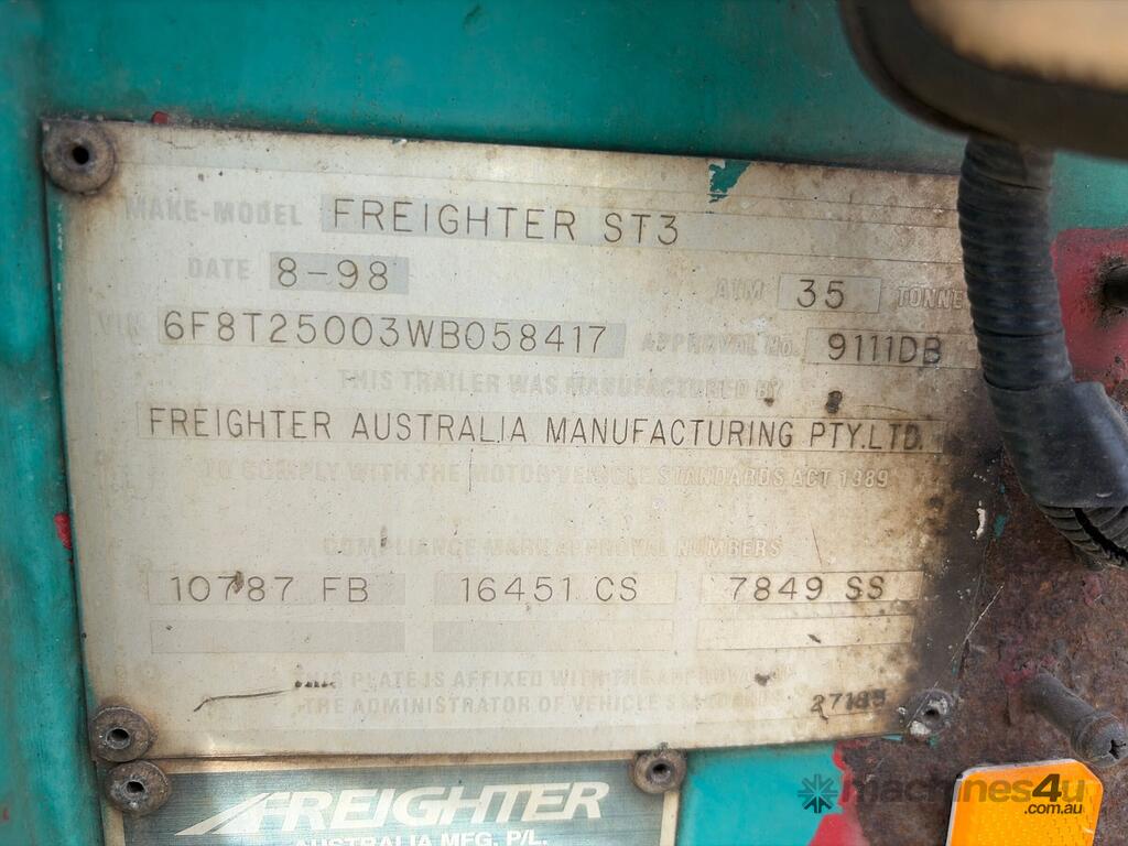 CP: 08/1998,Freighter,ST3,Tri Axle Drop Deck Curtainside B Trailer,130211 (Kms. Showing on Hubometer),Colour: Green,Rego. No: NP(1TKH474), Unregistered WA,VIN: 6F8T25003WB058417,Sold with No Plates