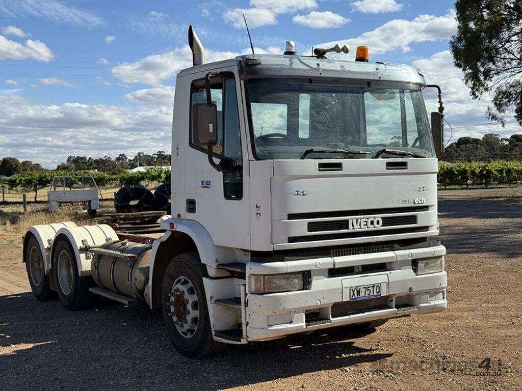 1998 IVECO Eurotech 3600 VIN: 6F2VFMT00WDE30133. Cursor 350hp motor,13sp road ranger, Hendrickson spring suspension,10 stud aluminium wheels, hydraulic return line, ballrace turntable, flashing beacon fitted, odometer 526455, Gear box jumps out of third gear. Suit farm truck. Please note compliance plate not sighted. Located Robinvale VIC.