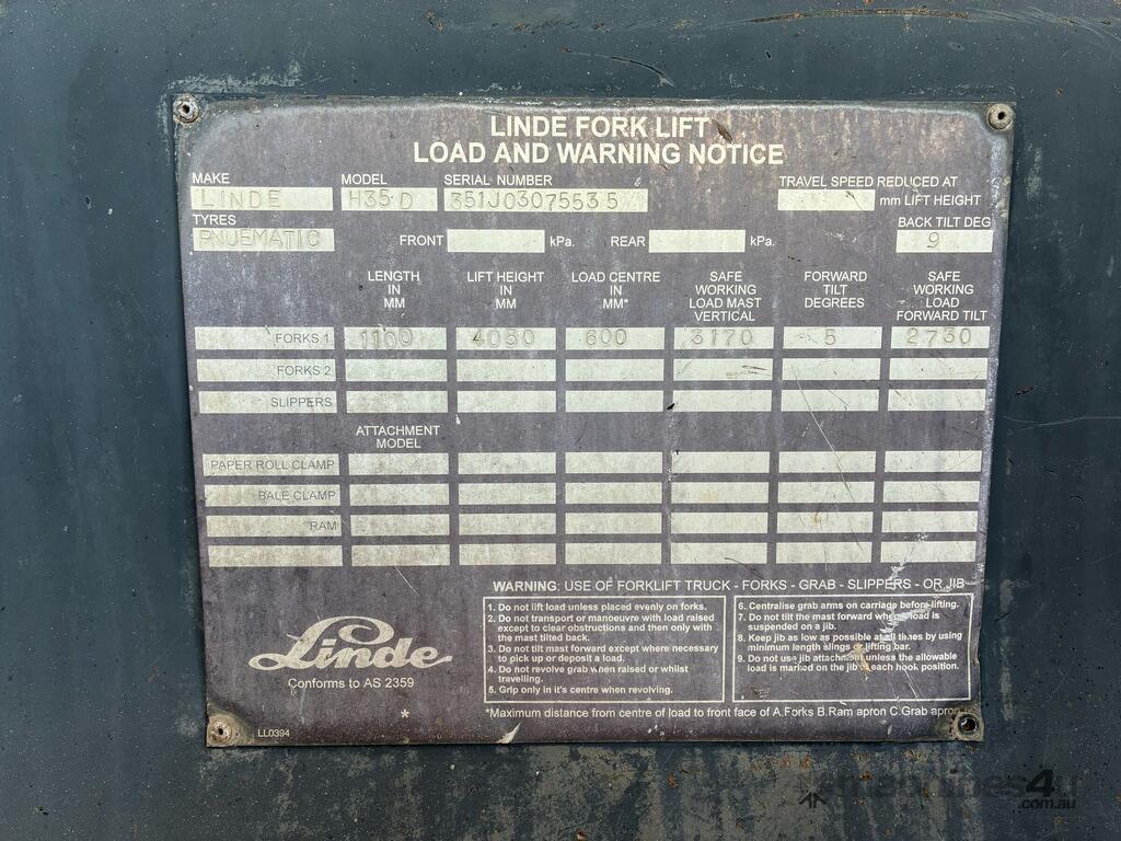 CP: CIRCA 1998,Linde,H35D-03,Forklift,3 Cyl,Diesel,Odometer not visible,147331 (Hrs. Showing on Hour meter),Colour: Red,Unregistered,Serial No: 351J03075535,Sold with No Plates,Key No: 331