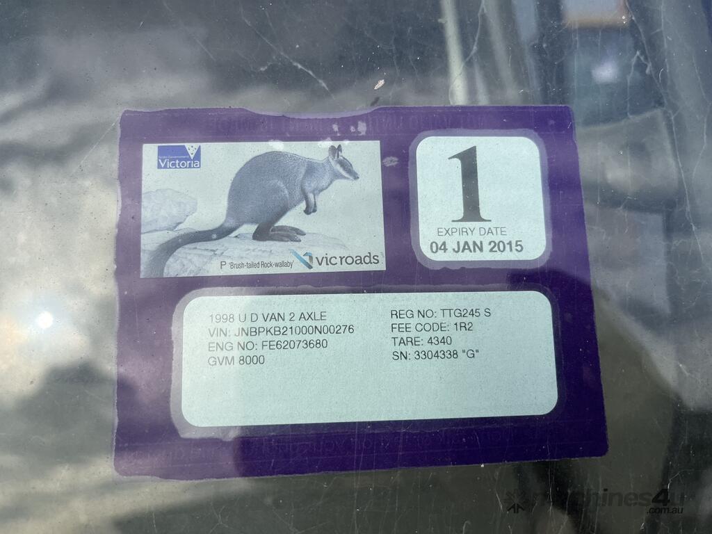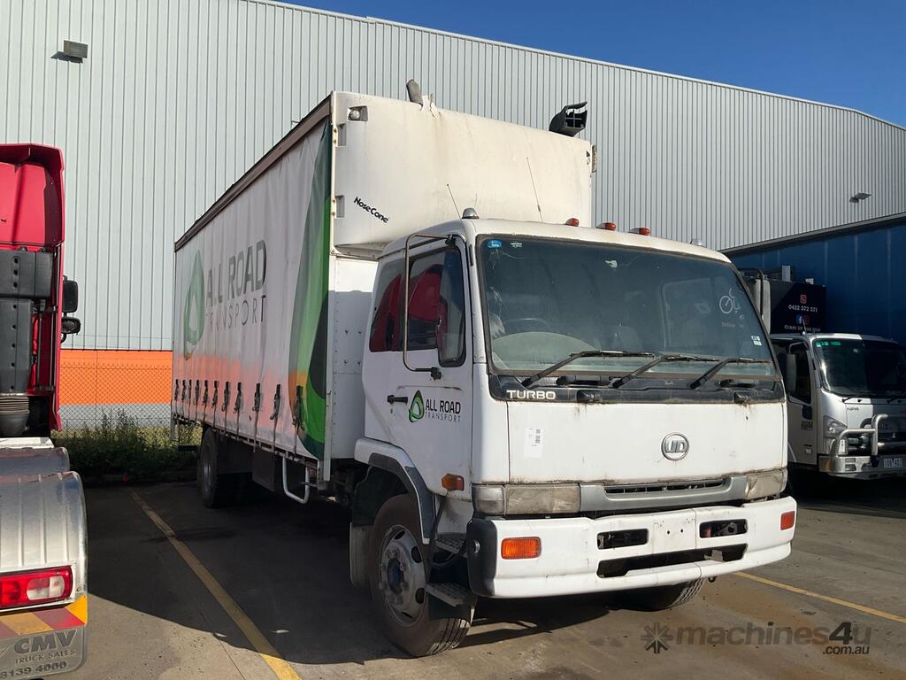 CP: CIRCA 1998,Nissan UD,Curtain Sider,Manual,Leaf Spring Suspension,6 Cyl,Diesel,785475 (Kms. Showing on Odometer),Hourmeter not visible,Colour: White,Unregistered,VIN: JNBPKB21000N00276,Sold with No Plates
