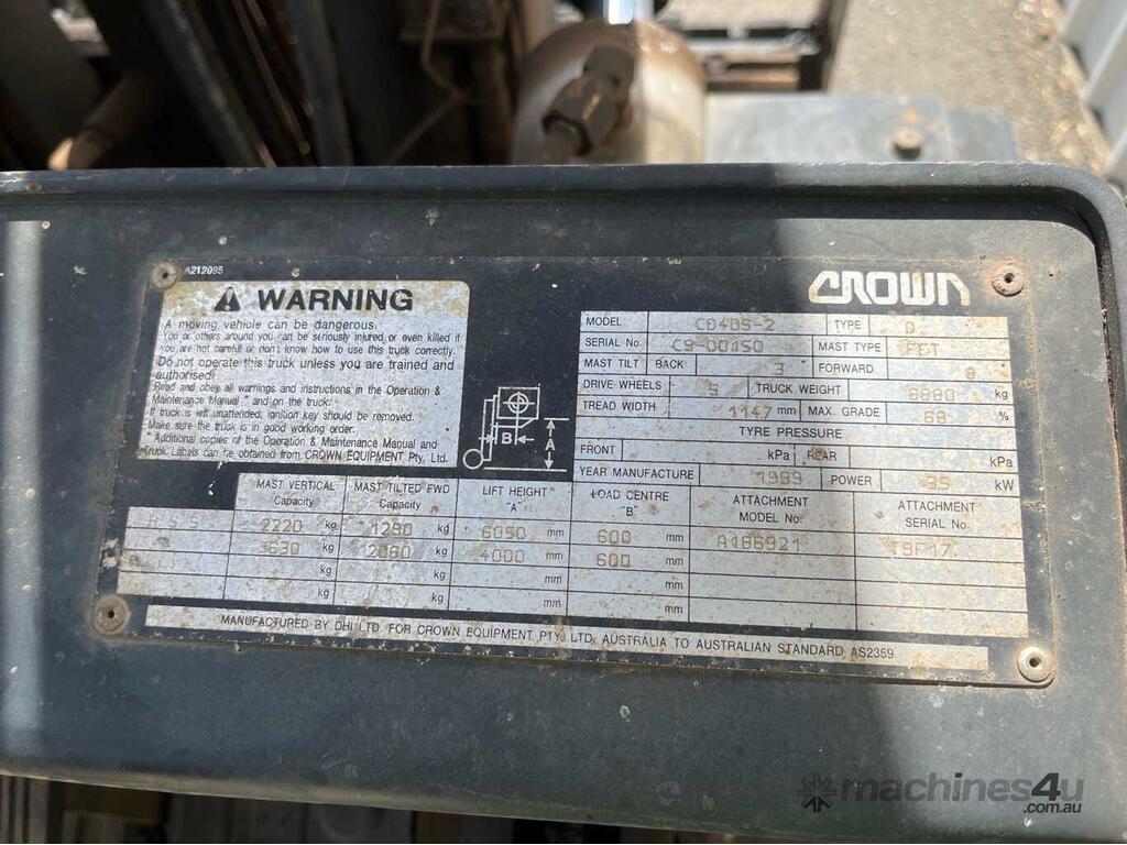 CP: CIRCA 1999,Crown,CD40S-2,2 Stage Forklift,6 Cyl,Diesel,Odometer not visible,5651 (Hrs. Showing on Hour meter),Colour: Grey,Unregistered,Serial No: C900150,Sold with No Plates
