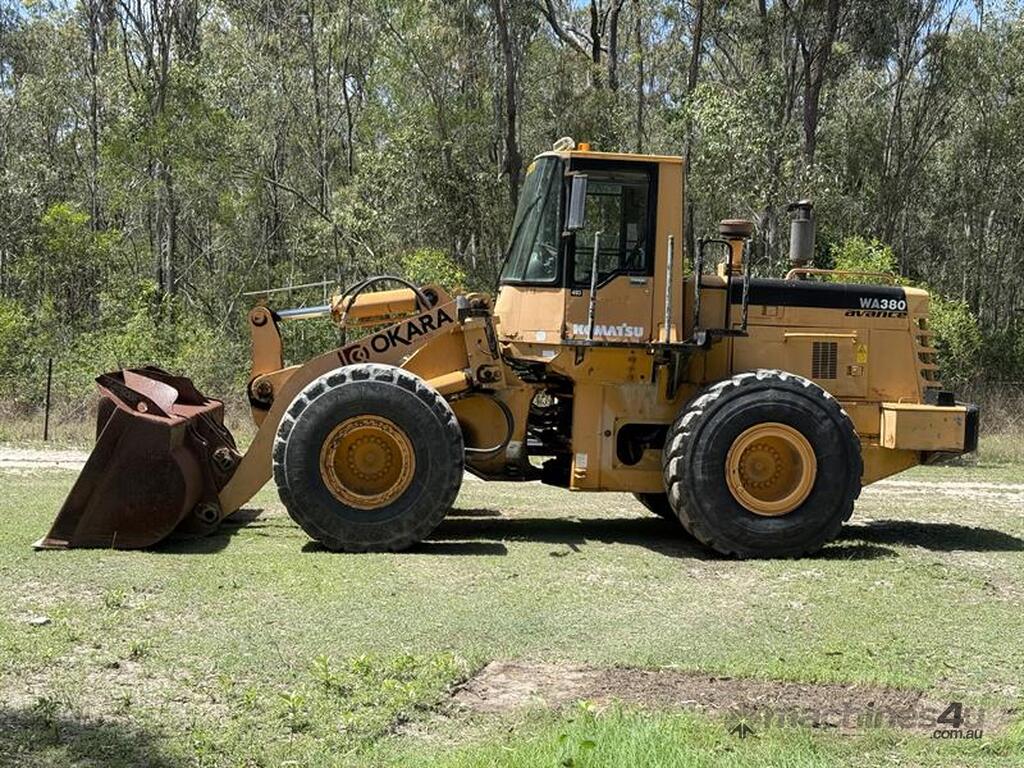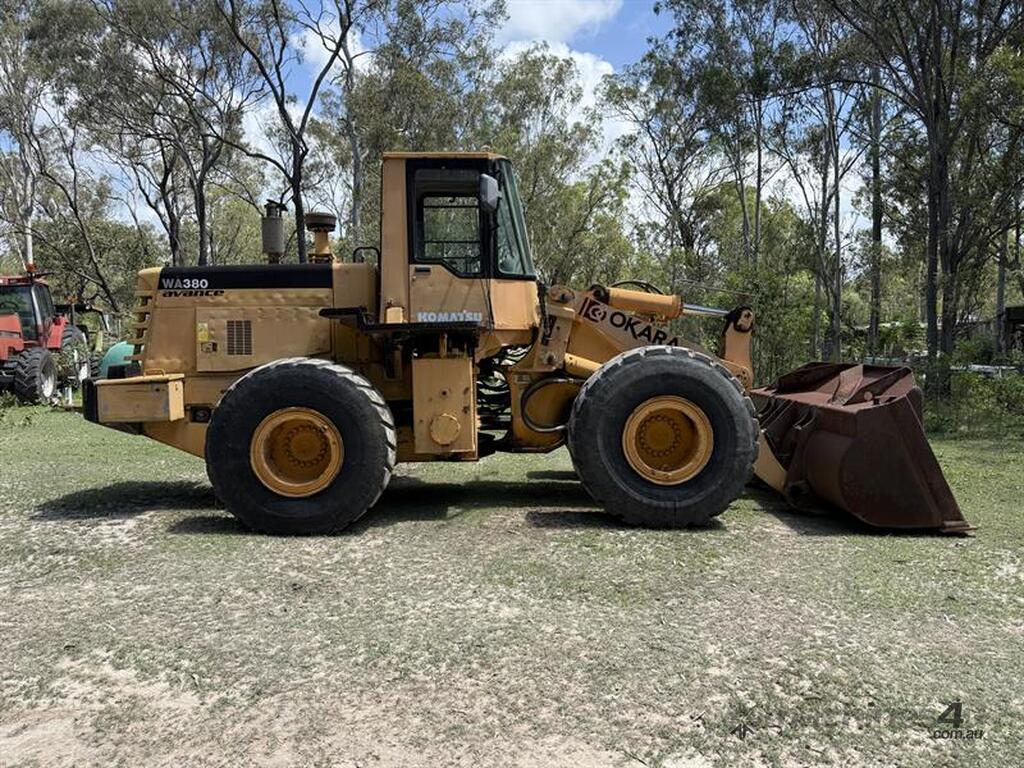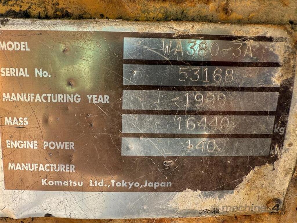 1999 KOMATSU WA380-3A WHEEL LOADER, S/N: 53168, E/N: ###, 11,941 HOURS SHOWING. 8 X SPARE TYRES, 4 ON RIMS. VARIOUS OIL LEAKS EVIDENT. LOCATION: 10KM SOUTH OF GLADSTONE, QLD 4680. INSPECTIONS & COLLECTIONS: BY APPOINTMENT ONLY. ENQUIRIES: JOHN MCDOUGALL ON OR JOHNEMERALDAUCTIONCENTRE