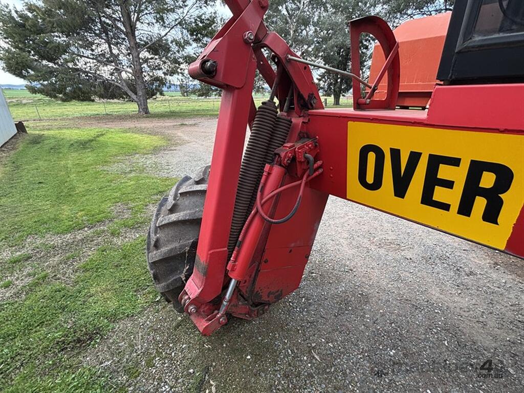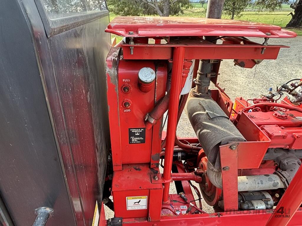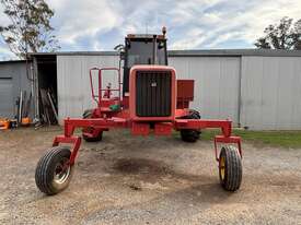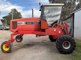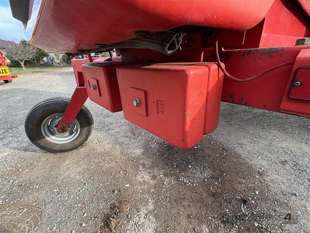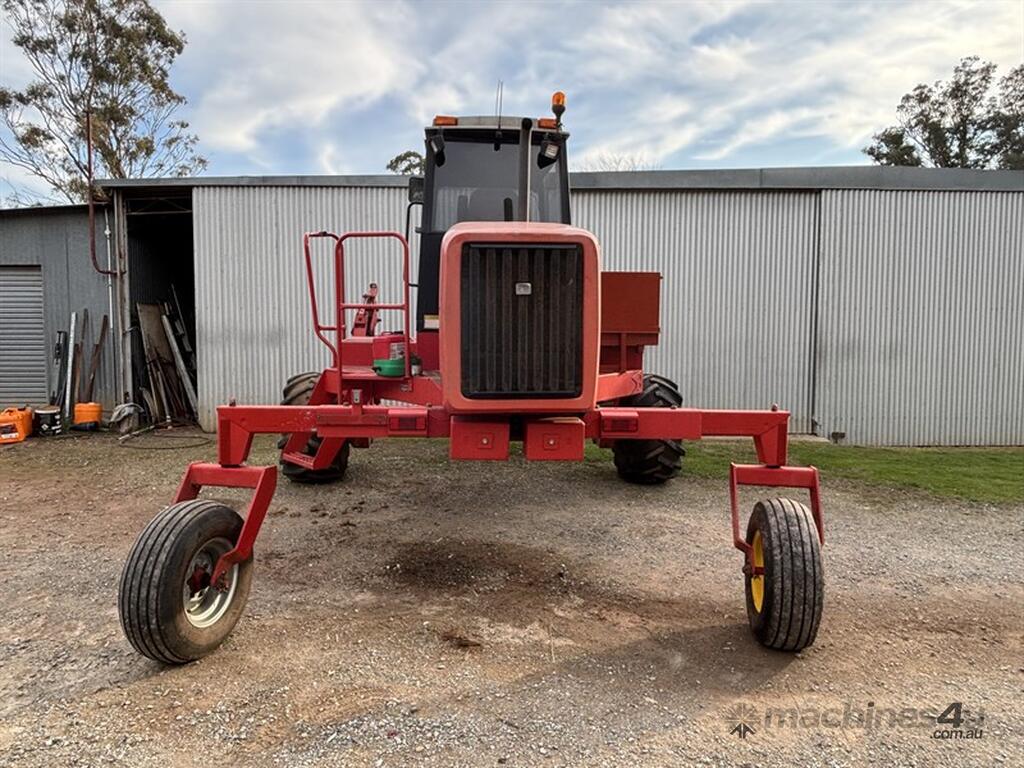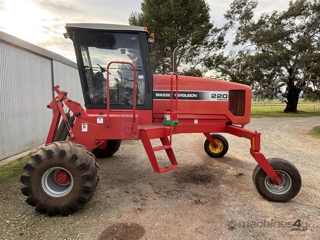 1999 MASSEY FERGUSON 220 SERIES II WINDROWER, S/N:H220585, genuine 1875hrs, 4cyl Perkins engine, extra hydraulic oil tank, NOTE: original silver rear rim also included, comes with 26' front on trailer, tyne reel, vertical knives, always shedded, excellent condition, located Peak Hill