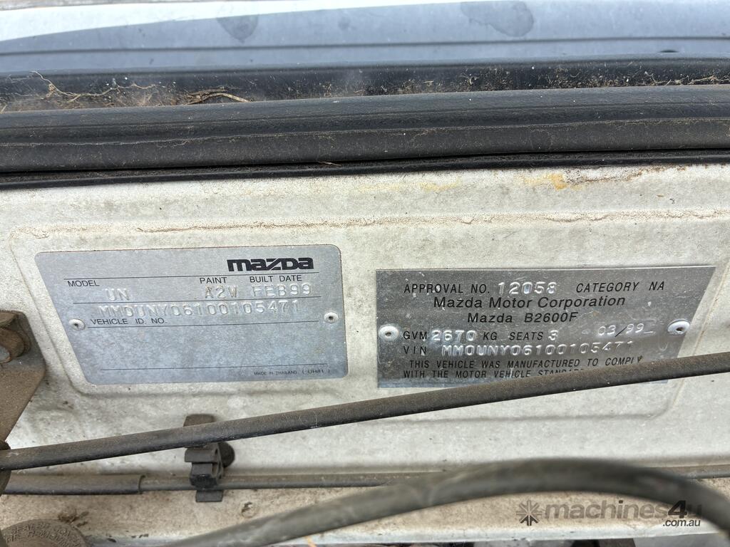 CP: 03/1999,Mazda,Bravo,B2600 DX,Utility Single Cab,2 doors,Manual,Engine #: G6226616,2.6 Ltr,4 Cyl,Petrol - Unleaded ULP,Multi-Point Injection,5 Gears,Odometer not visible,Colour: White,Rego. No: NP(838DG7), Unregistered QLD,VIN: MM0UNY1,Sold with No Plates