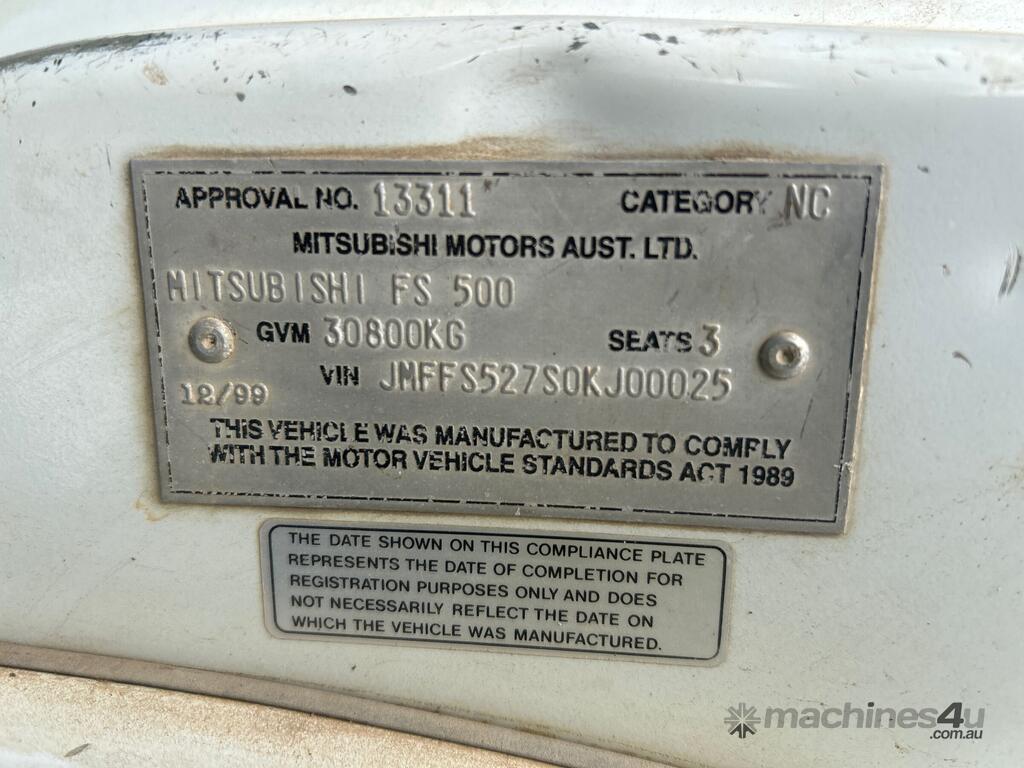 CP: 12/1999,Mitsubishi,FS500,Tipper,Manual,Spring,6 Cyl,Diesel,13 Gears,824788 (Kms. Showing on Odometer),Hourmeter not visible,Colour: White,Rego. No: NP(XB75QL), Unregistered NAT,VIN: JMFFS527S0KJ00025,Key No: 63,GVM: 30800,GCM: 45500,Sold with No Plates,WOVR Status: WOVR N/A,Incident Type: Not Applicable,Key No: 63