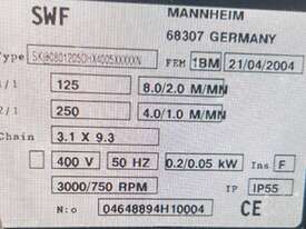 6. SWF MANNHEIM by MILLSOM 125kg (250kg 2-SPEED) 415v ELECTRIC CHAIN HOIST Model 1BM, HEAVY DUTY, MADE IN GERMANY Year 2004, VERY COMPACT FLAT BOTTOM DESIGNED FOR LIFTING VACUUM LIFTERS, AS NEW CONDITION