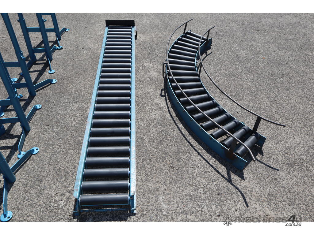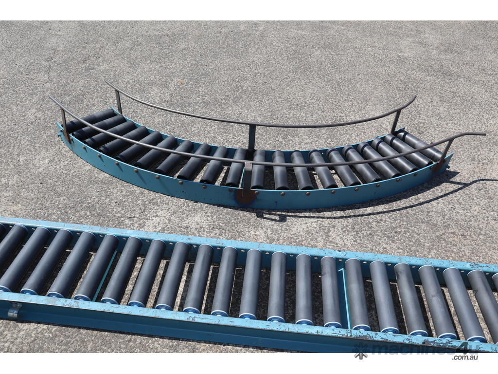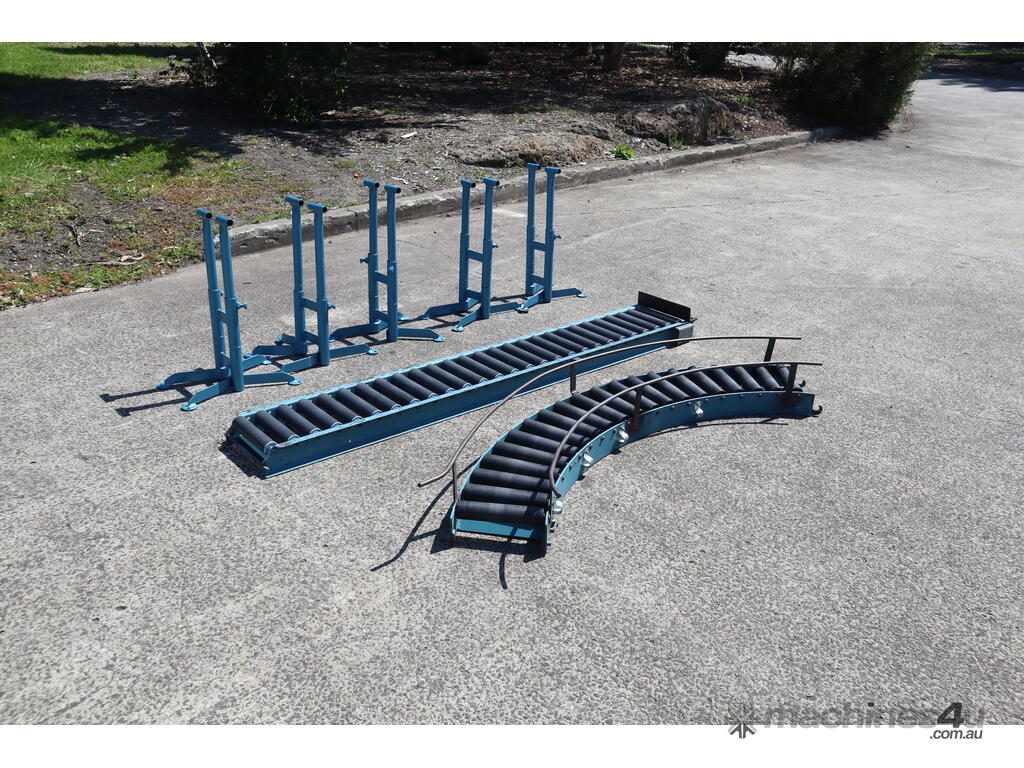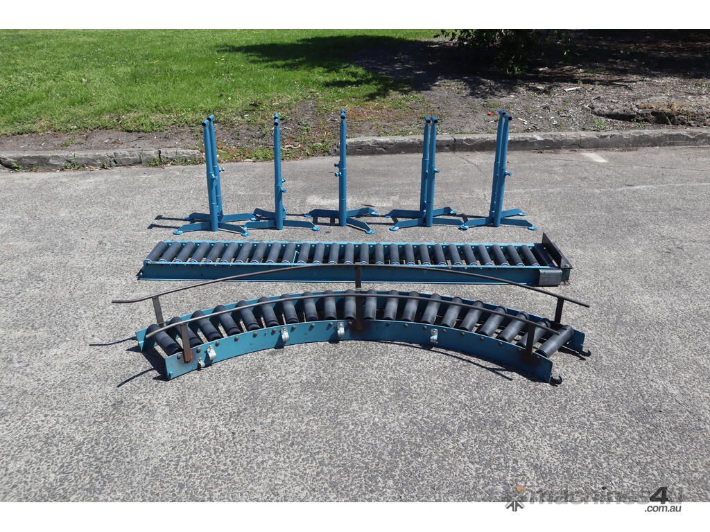 - Description: Roller Conveyor Set, straight and curved sections, with multiple adjustable stands.