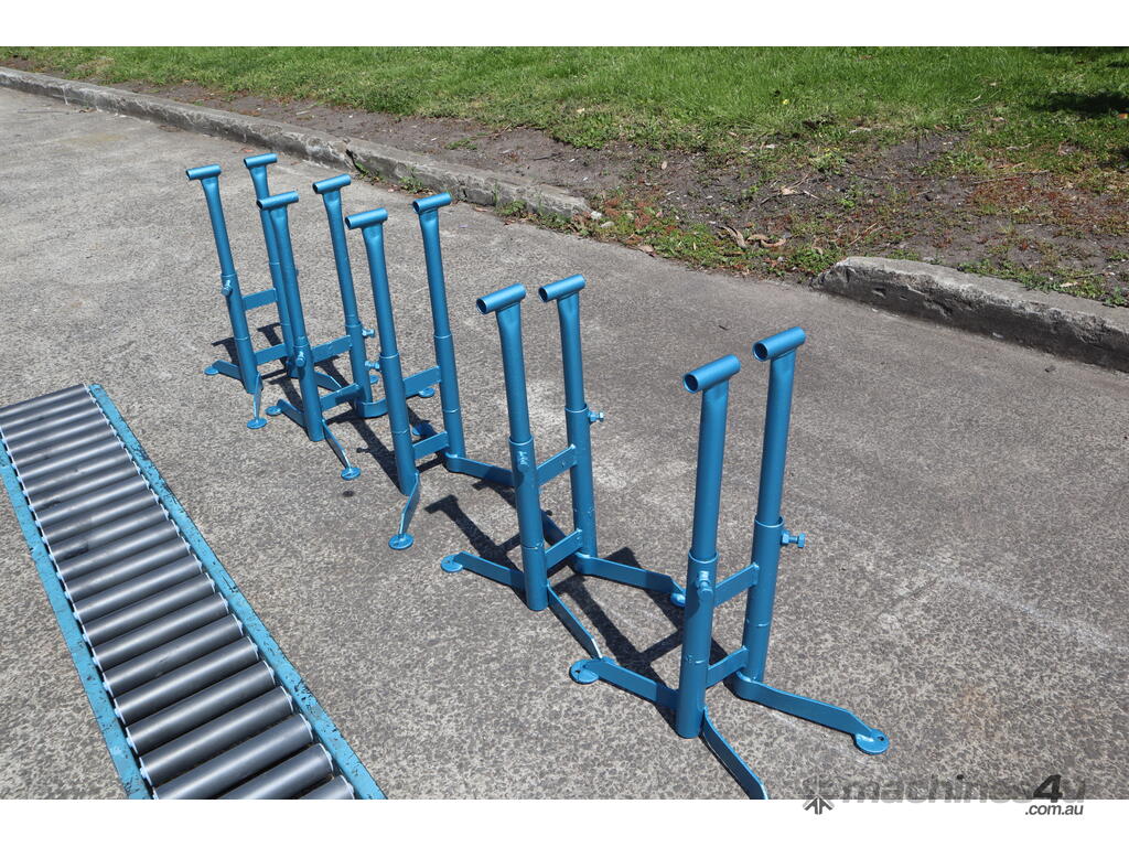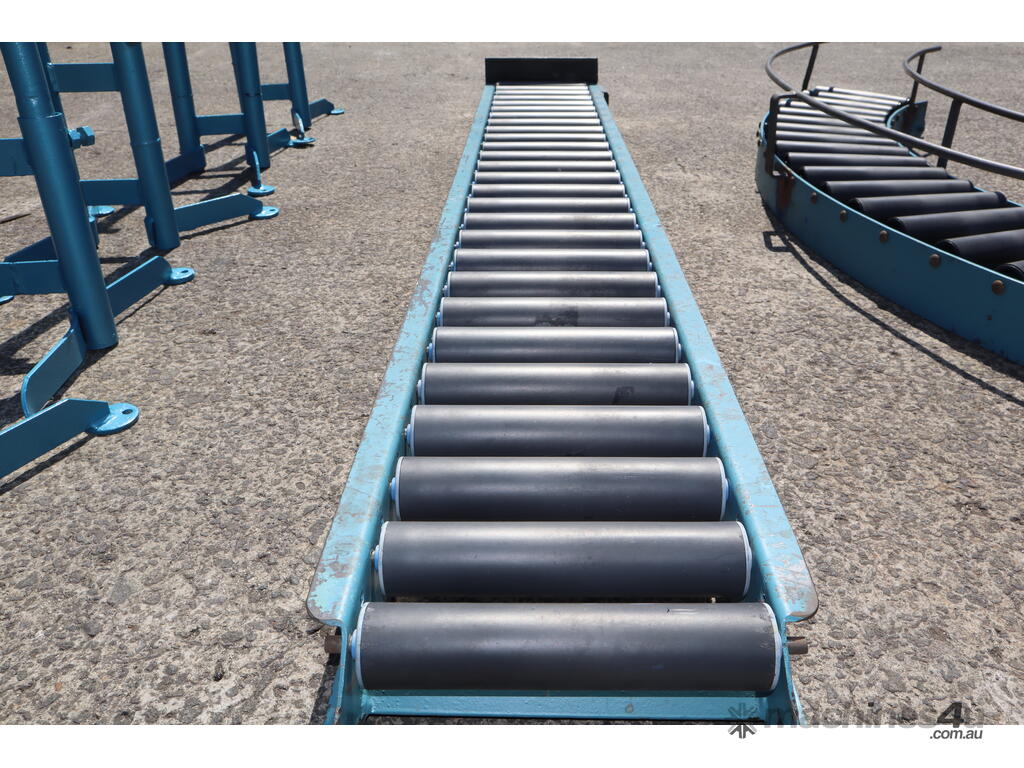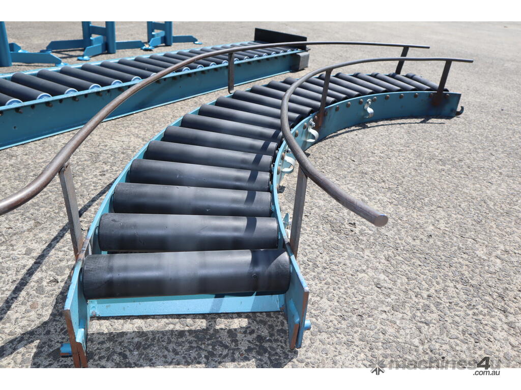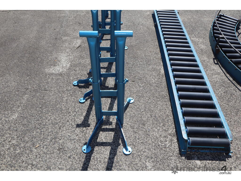 - Description: Roller Conveyor Set, straight and curved sections, with multiple adjustable stands.