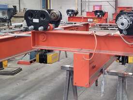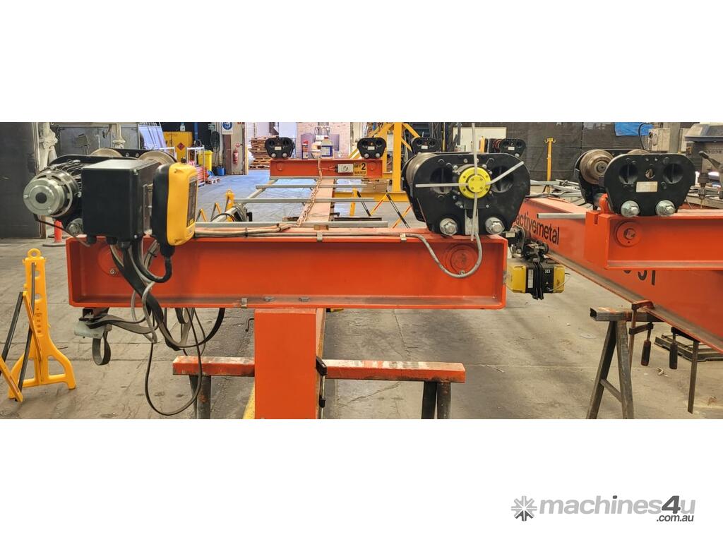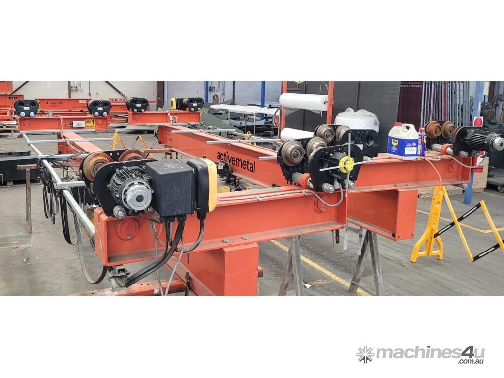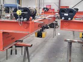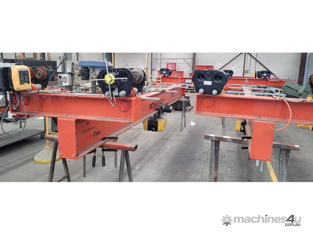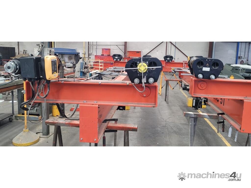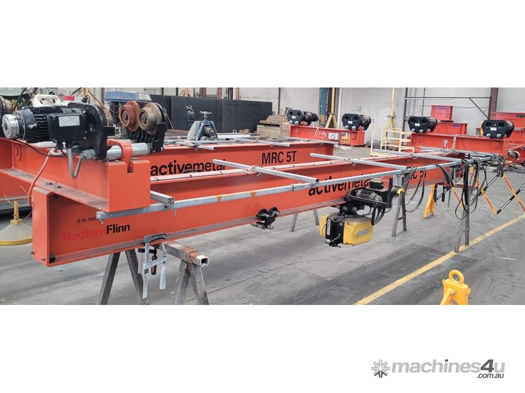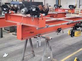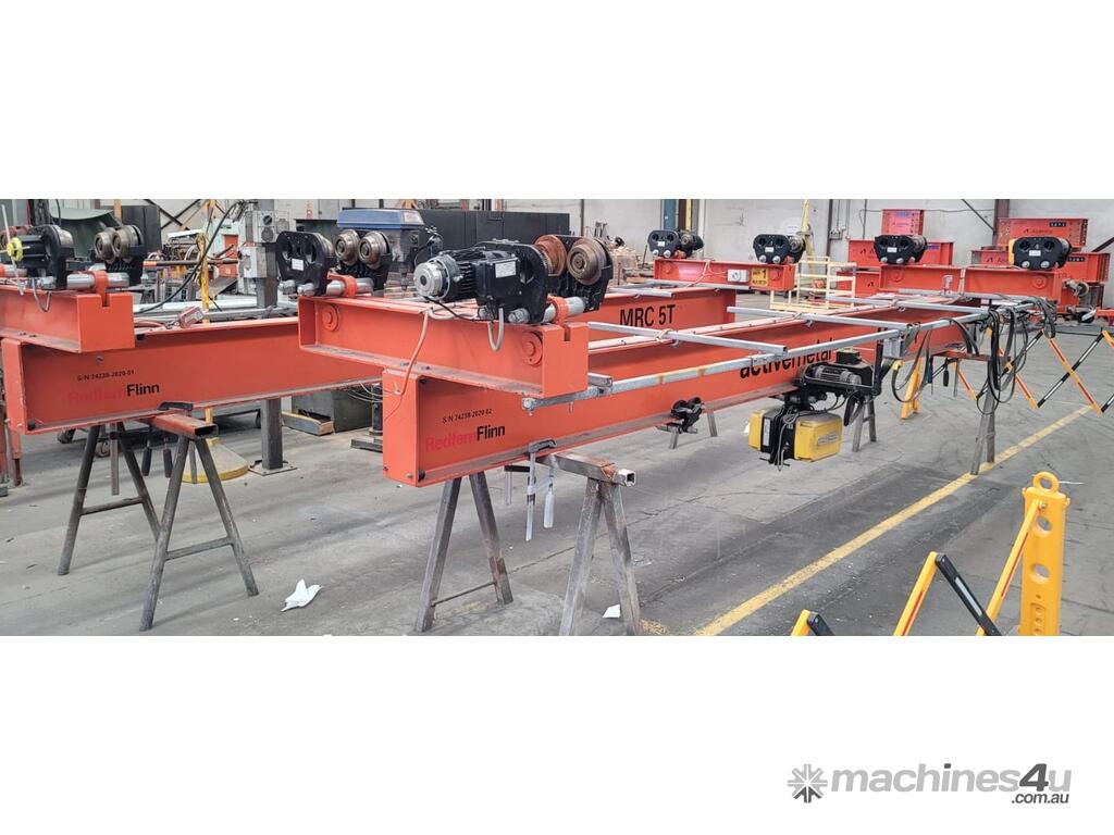 Still in Very Good Condition - Manufactured by Redfern Flinn, only used on one project. Two overhead travelling cranes (Beam length 5220mm) with a rated capacity of 5T, complete with 2 x 5T GIS 2 speed Electric Chain Hoists and Chain Boxes with a chain capacity for a 40m drop, GIS motors on cross travel and Sundrive remote controllers. Long Travel Beams not included.